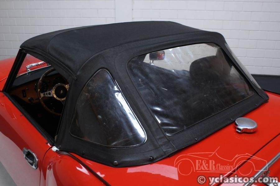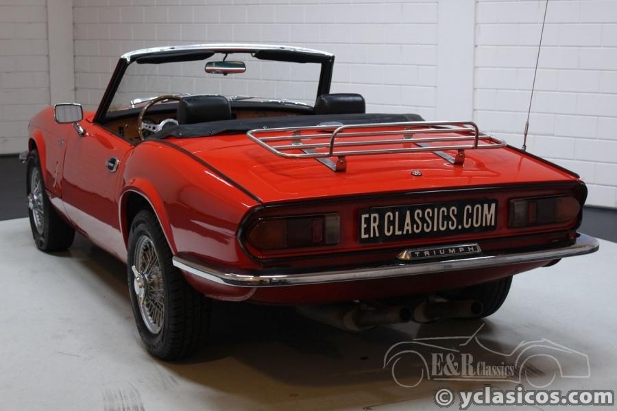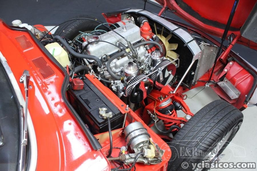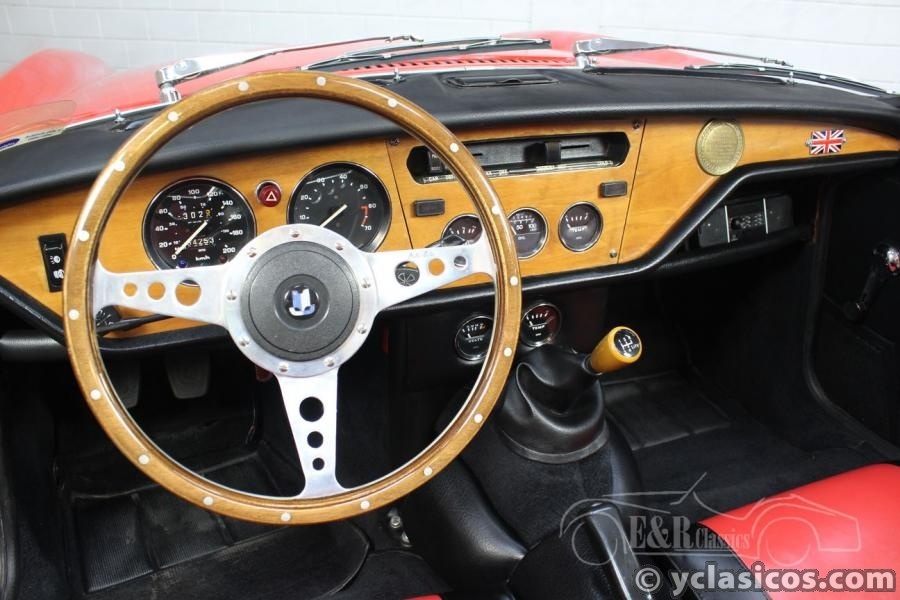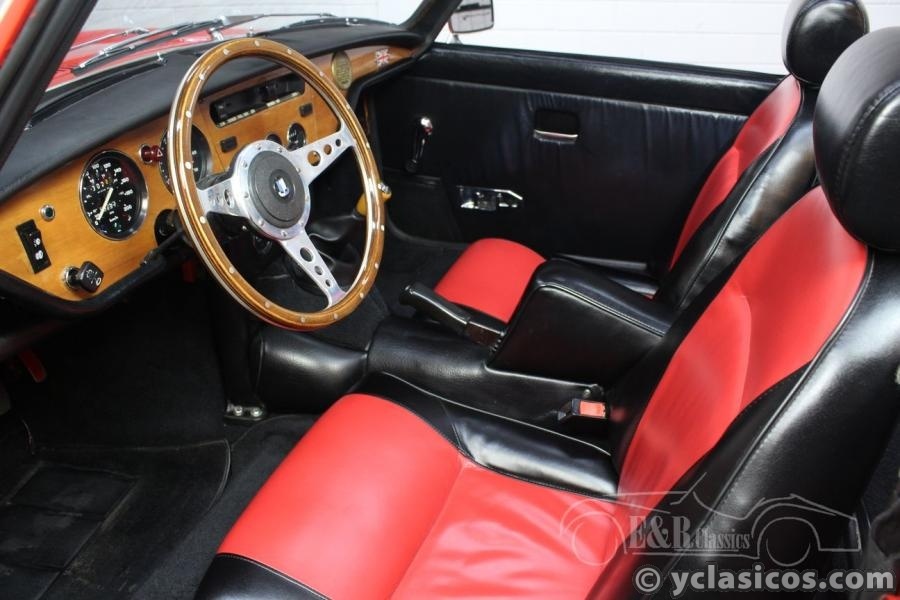 For sale: This very good driving Triumph Spitfire 1500 Cabriolet, built in 1977. This beautiful classic roadster was delivered as a new car in Belgium and restored around 2001. The red paintwork, the red / black interior and the black soft top are in very good condition. The smooth 1.493cc four-cylinder engine makes the Triumph a fantastic driving car, the dual exhaust ensures a very sporty sound! Furthermore, this beautiful Spitfire is equipped with wire wheels, wooden dashboard, wooden steering wheel and a chrome luggage rack. Are you looking for a very well maintained Triumph Spitfire 1500? These and other Spitfires are present in our showroom. You're welcome!