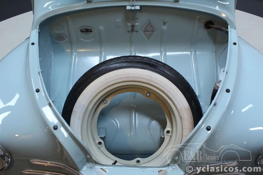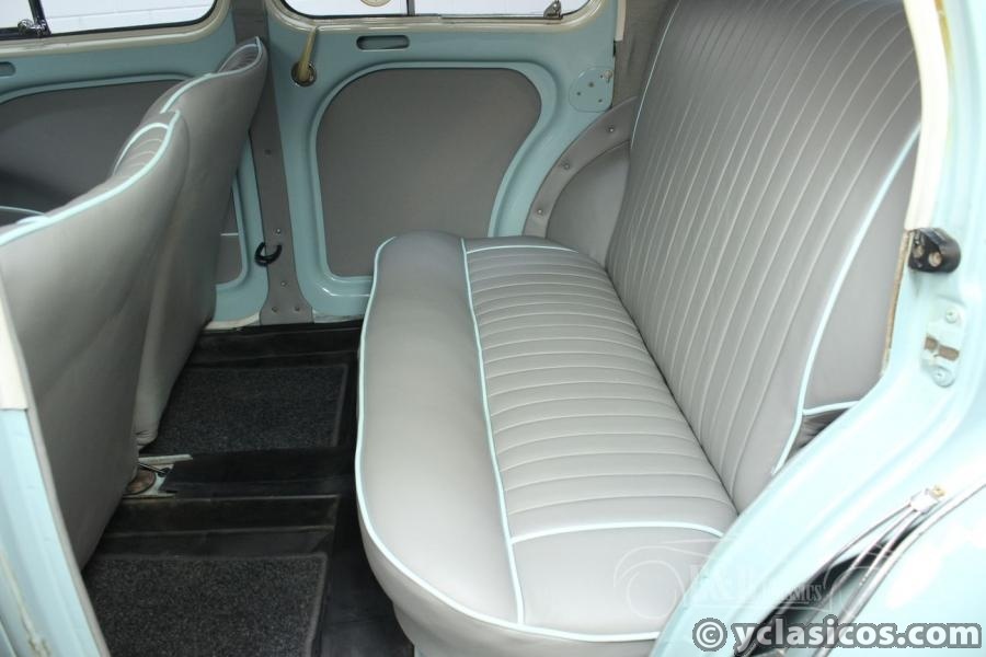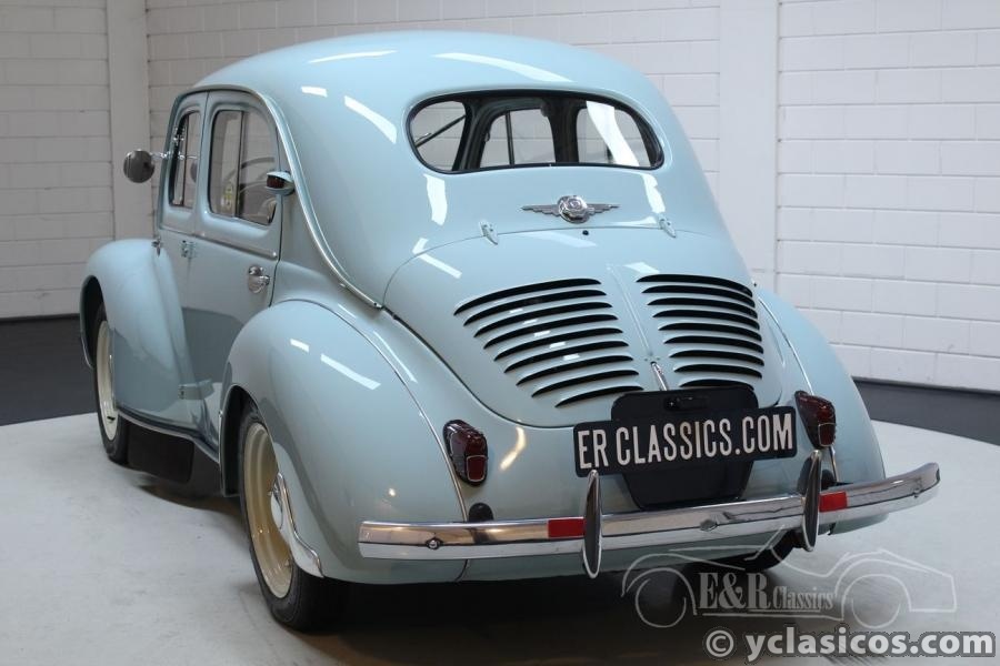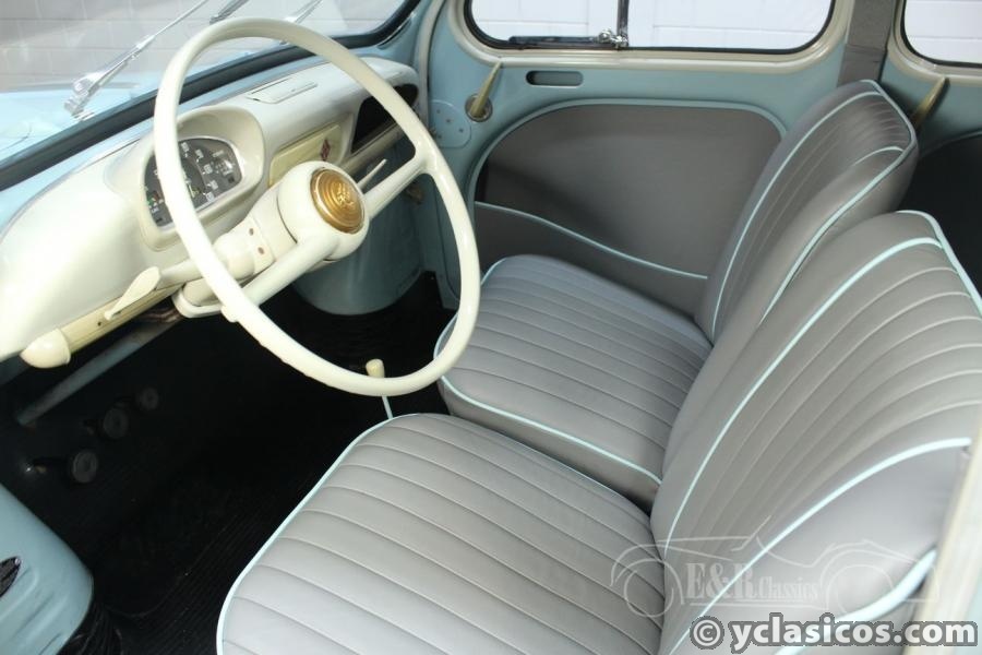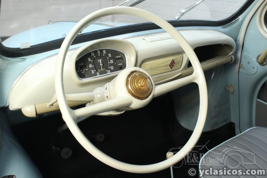 This Renault 4CV was built in 1957 and is in a very beautiful condition. This French classic car has been extensively restored and very well maintained since then. A photo reportage of the restoration is present with the car. The paintwork in the color light blue combines very nicely with the grey interior with white steering wheel and dashboard. A very fresh colour combination! The Renault drives great, thanks to the 747cc four-cylinder engine and the manual gearbox. In short, are you looking for a Renault 4CV in top condition? Contact us for more information.