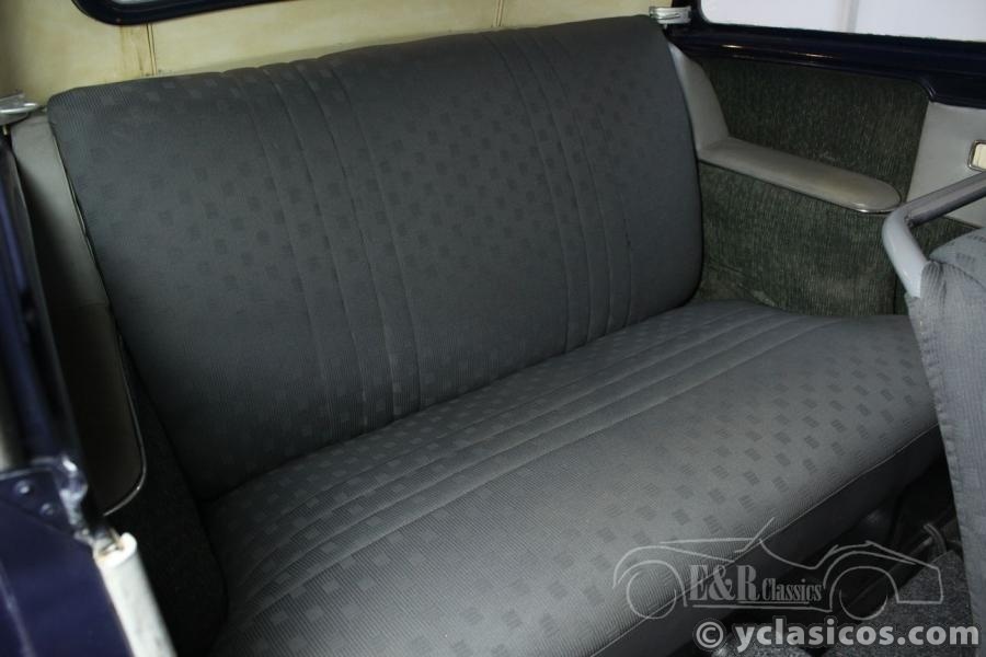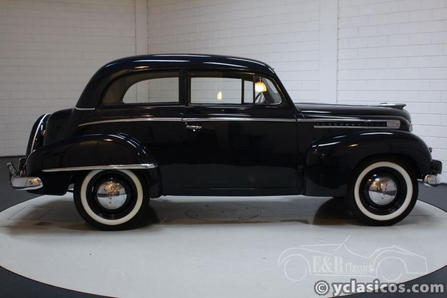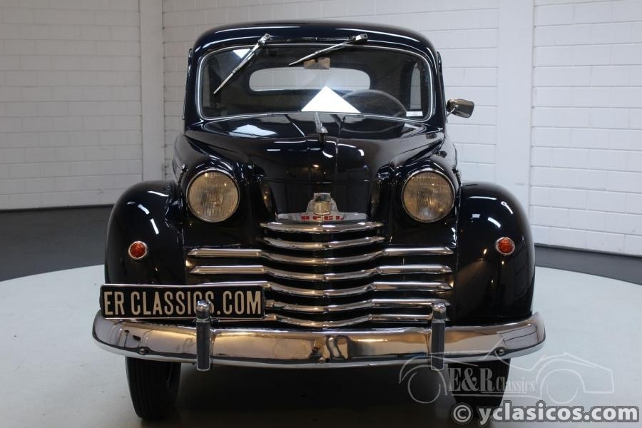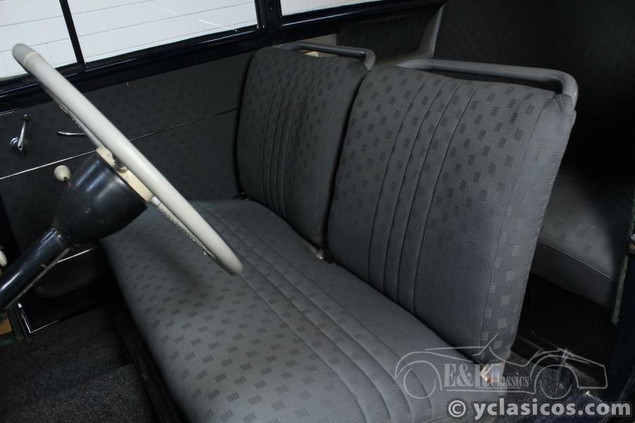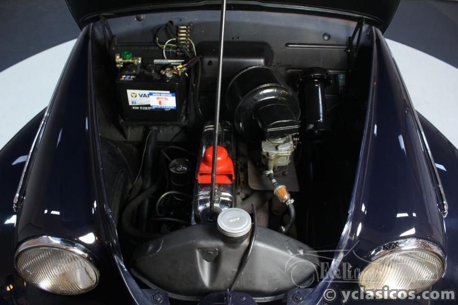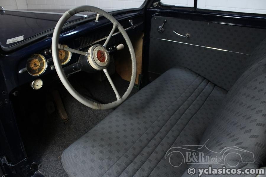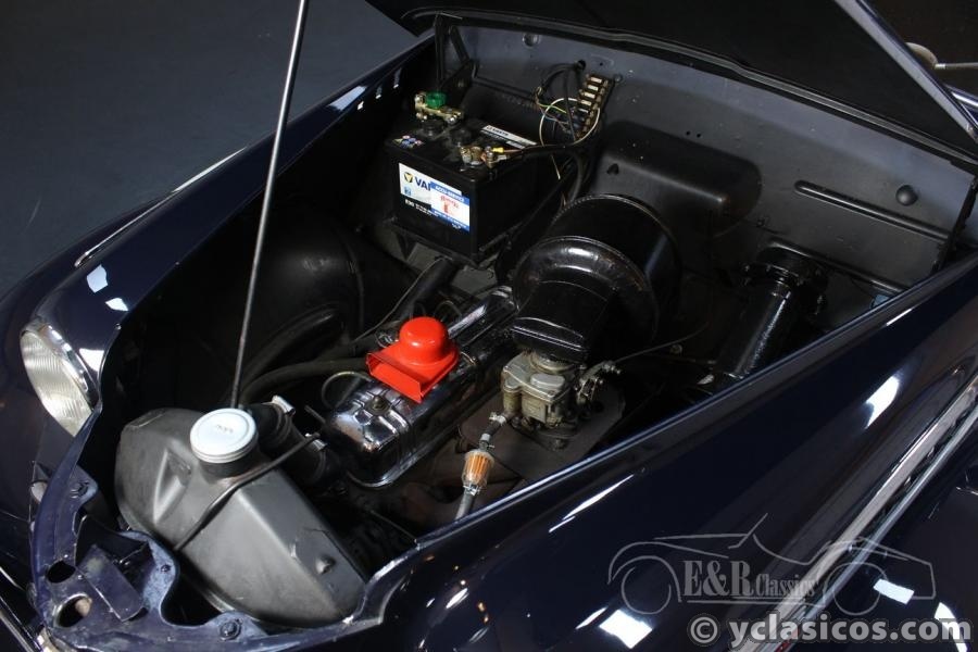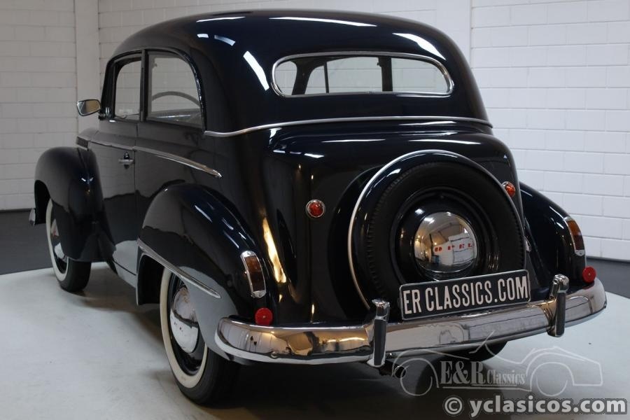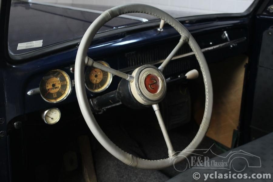 This Opel Olympia was built in 1950. It is a 2-door sedan version. A rare model of the Opel Olympia, this type with the characteristic wheel on the back was only built in 1950. The paintwork is deep dark blue with many chrome accents around the car. The interior is equipped with beautiful grey fabric upholstery, steel dashboard and classic three-spoke steering wheel. The Opel is equipped with a 1.488cc four-cylinder engine and manual gearbox. Are you looking for a very special German classic? This Opel Olympia is present in our showroom. You're very welcome.