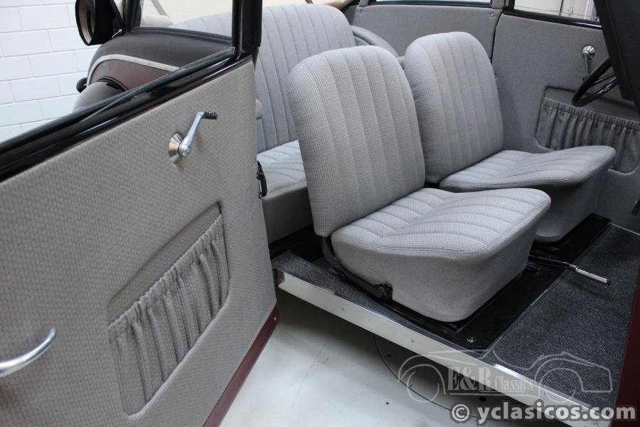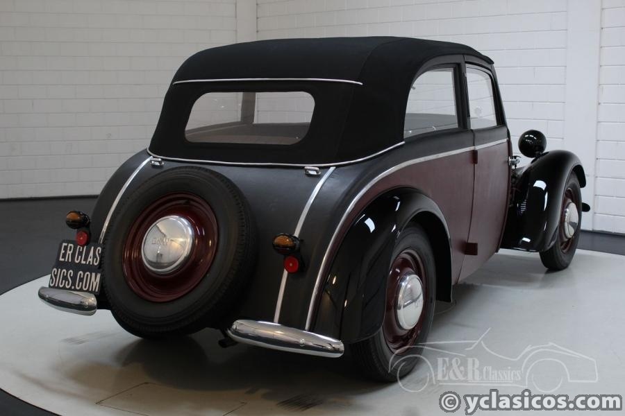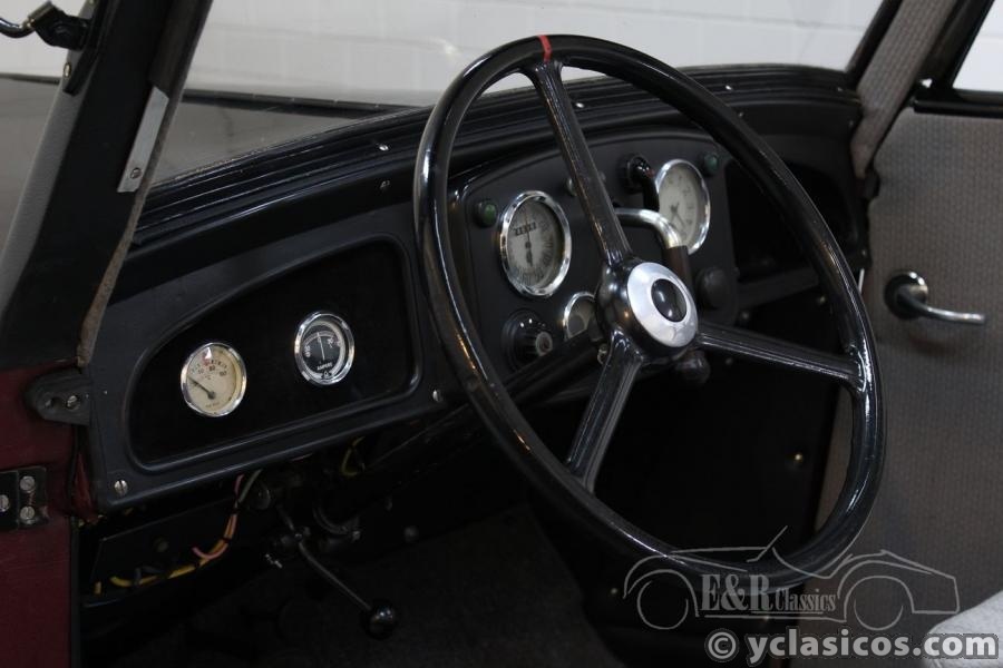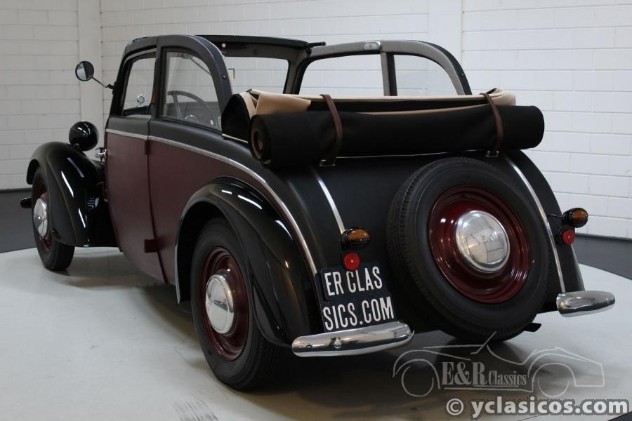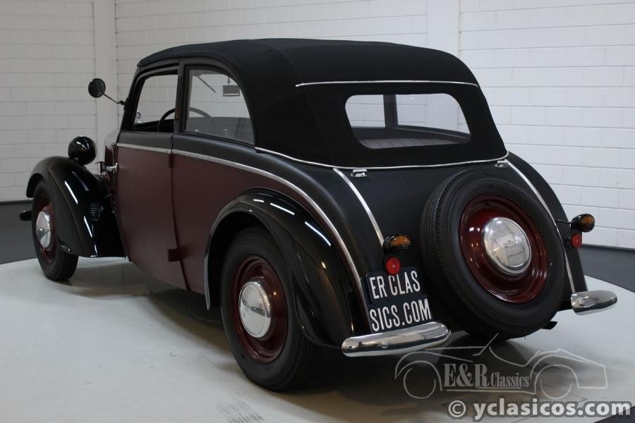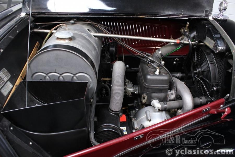 This beautiful DKW F7 was built in 1938. It is a Cabriolet Saloon version, a four-seater convertible whose window frames remain when the soft-top is opened. The DKW was extensively restored in the period between 2012 and 2018 by an enthusiast who owned the car for more than 45 years. The F7 has a beautiful dark red with black colour scheme and a grey interior. The body is, as original, largely covered with vinyl. The DKW is equipped with a 692cc two-cylinder two-stroke engine, the largest engine available in the F7 at the time and was therefore called “Meisterklasse”. The DKW has a manual gearbox and front-wheel drive, which was very progressive at the time and was not common on production cars. Are you looking for a unique and beautifully restored pre-war German classic? This DKW F7 Meisterklasse Cabriolet Saloon is available in our showroom!