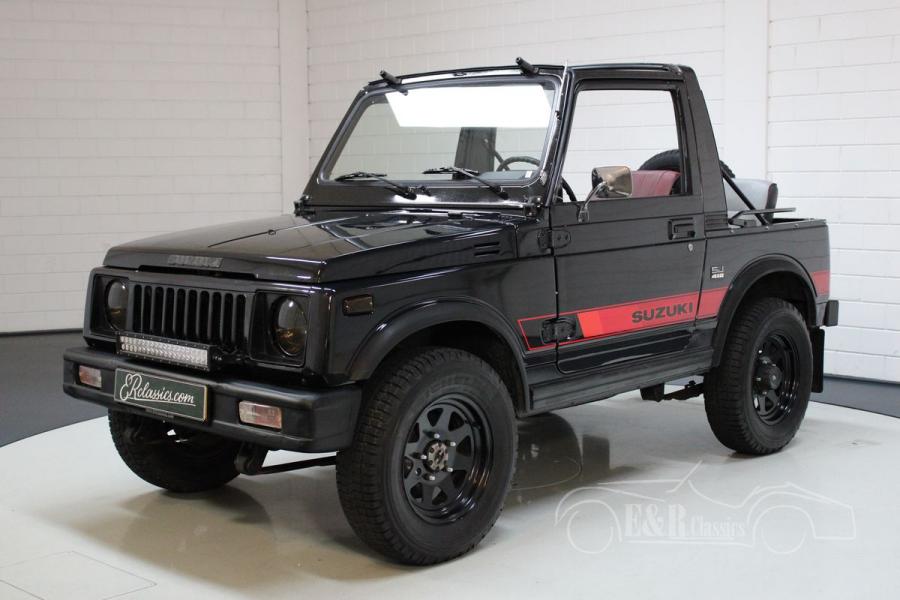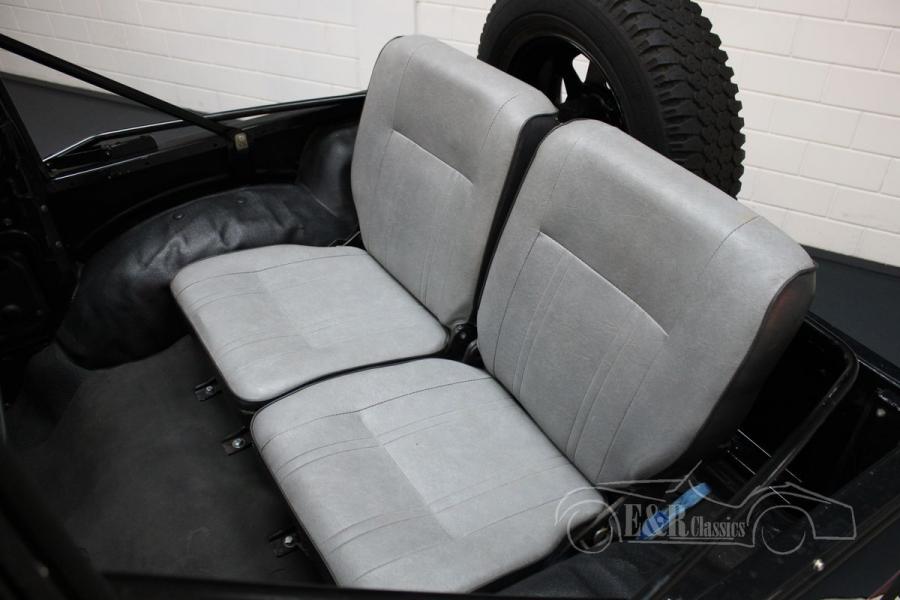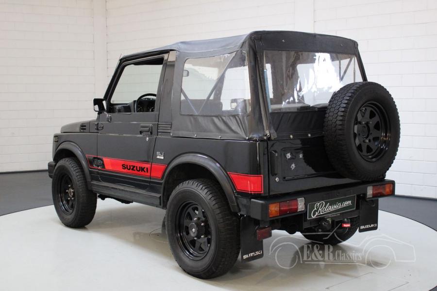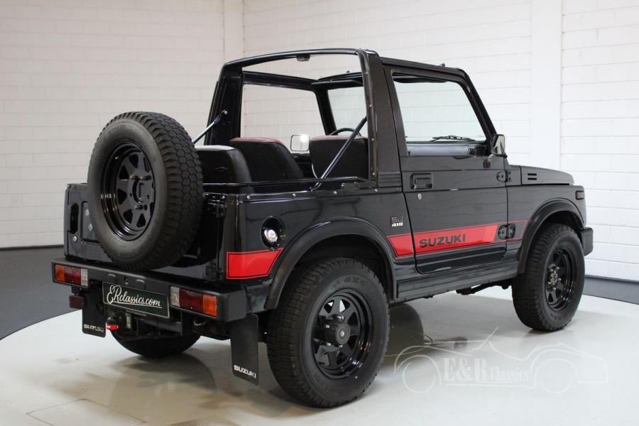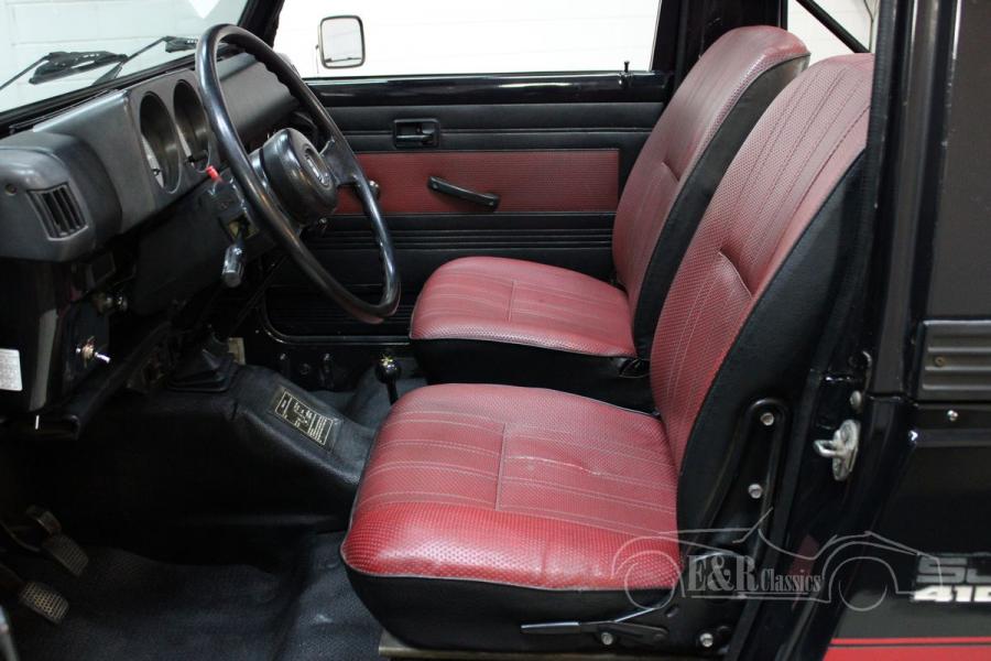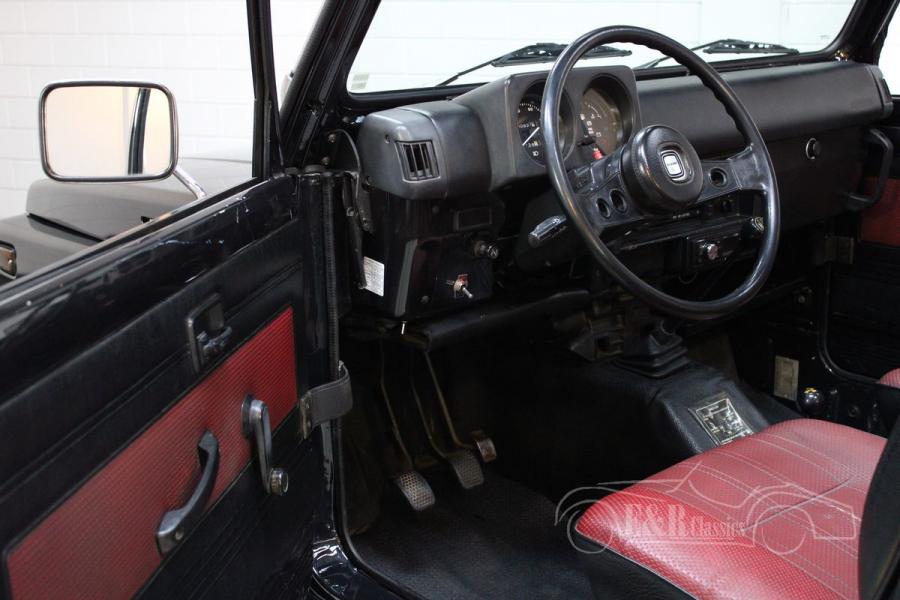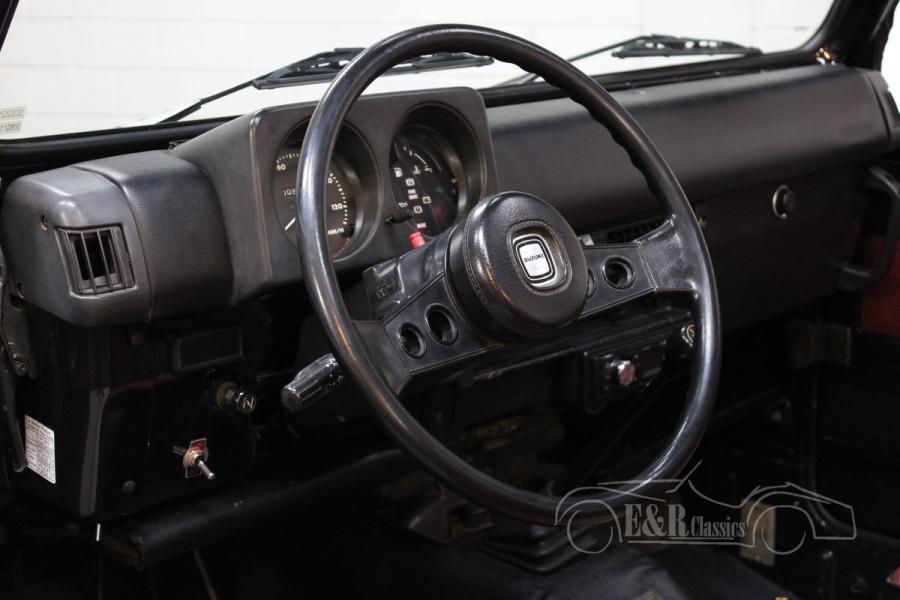 This 1984 Suzuki SJ410 Q Deluxe convertible, restored a few years ago, has the fine 970cc 4-cylinder engine with manual gearbox and 4x4 drive. The body has beautiful black paint in combination with a good black soft top. The interior with 4 seats is in good condition and has a red and black upholstery. This Suzuki SJ410 is equipped with a super bright spotlight, sporty exhaust and a very handy towbar. The engine was overhauled during the restoration and has run only 937 kilometers since then. Photos of the restoration are available. Invoices of maintenance are also available. This SJ410 has been in the possession of 1 enthusiast for 13 years. Are you looking for a manoeuvrable and in very good condition 4x4? Then this Suzuki SJ410 Q Deluxe is highly recommended. For more information or a personal shop video, please contact one of our sales people.