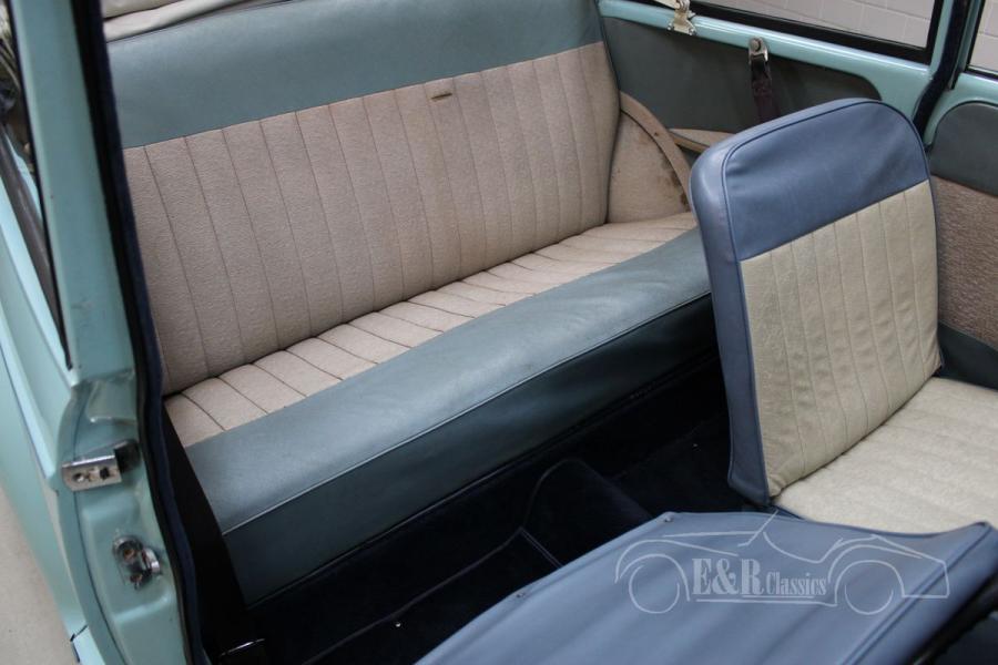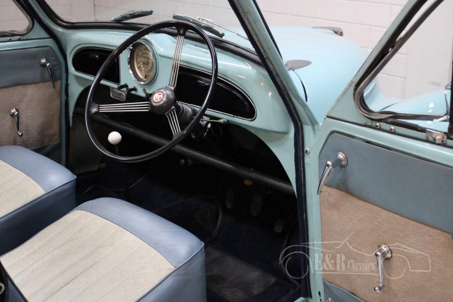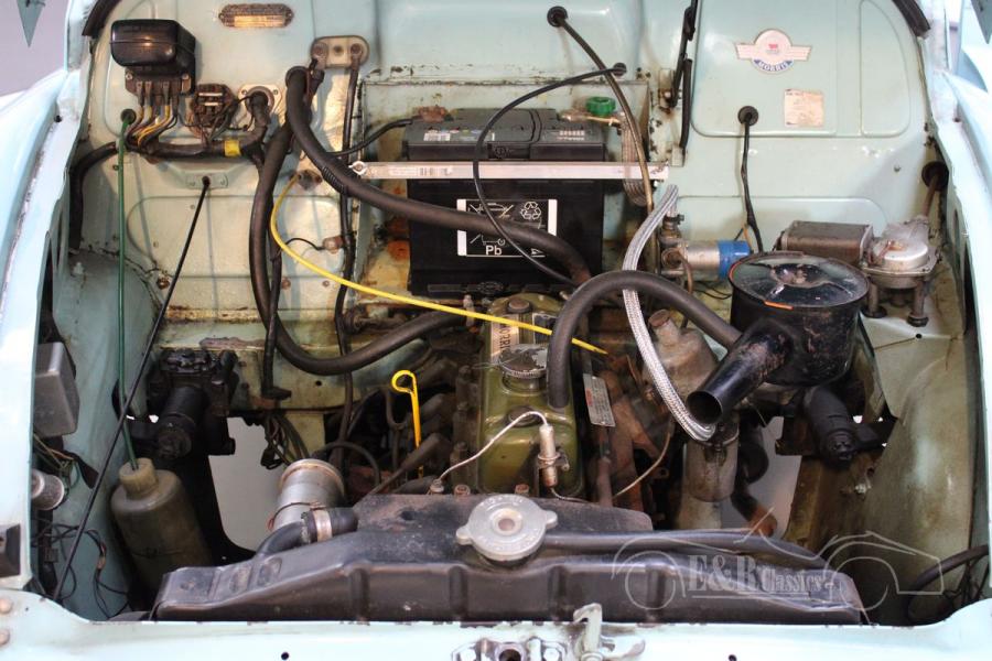 The Honolulu blue paint makes this Morris Minor a unique appearance. This classic car is in good condition and has always been well maintained by the previous owner. The soft top is dark blue in colour and contrasts nicely with the light blue paint of this classic car. The Morris Minor 1000 convertible has period correct steel Old English White wheels with chrome hubcaps. The interior is in very good condition, standard blue over white. As befits a true British classic, the car is right-hand drive.