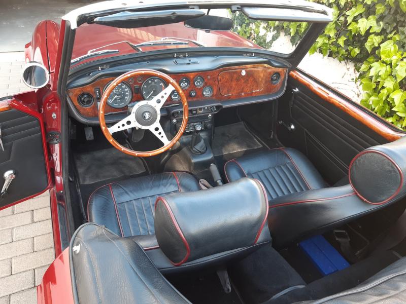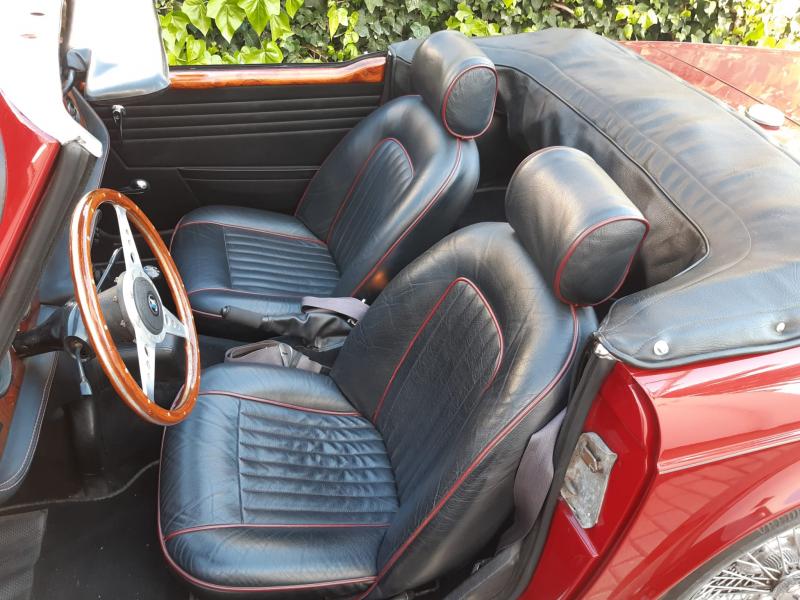 Tapicería de cuero negro fileteada en rojo, guardamanos de madera.