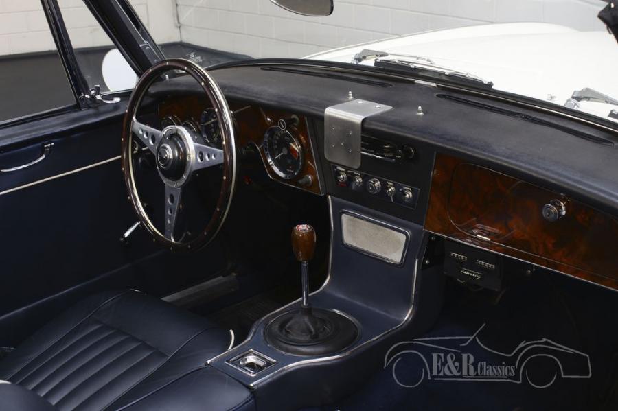 The two-tone paint in the colours Old English White and dark blue make it a real eye-catcher. The Healey is also equipped with a badge bar with spotlights, leather upholstery with white piping, Moto Lita wooden steering wheel and wooden dashboard, mohair soft top and beautiful chrome wire wheels. Technically, this Austin Healey 3000 MK3 is equipped with various upgrades such as overdrive, an aluminum fuel tank, oil pan and valve cover, Kenlowe fan and separate braking system. In short, a beautiful Austin Healey that not only looks fantastic, but is also technically very fully equipped.