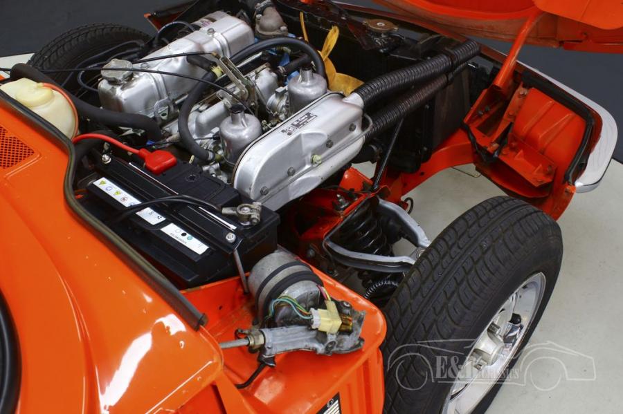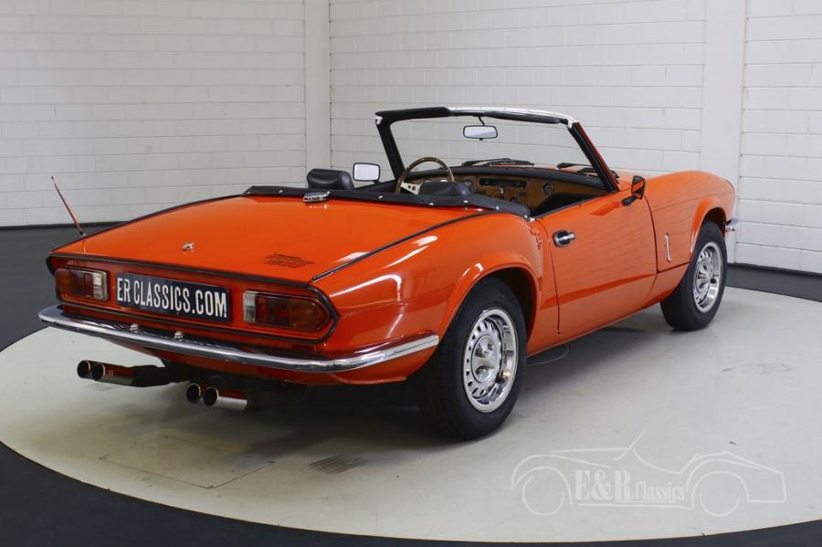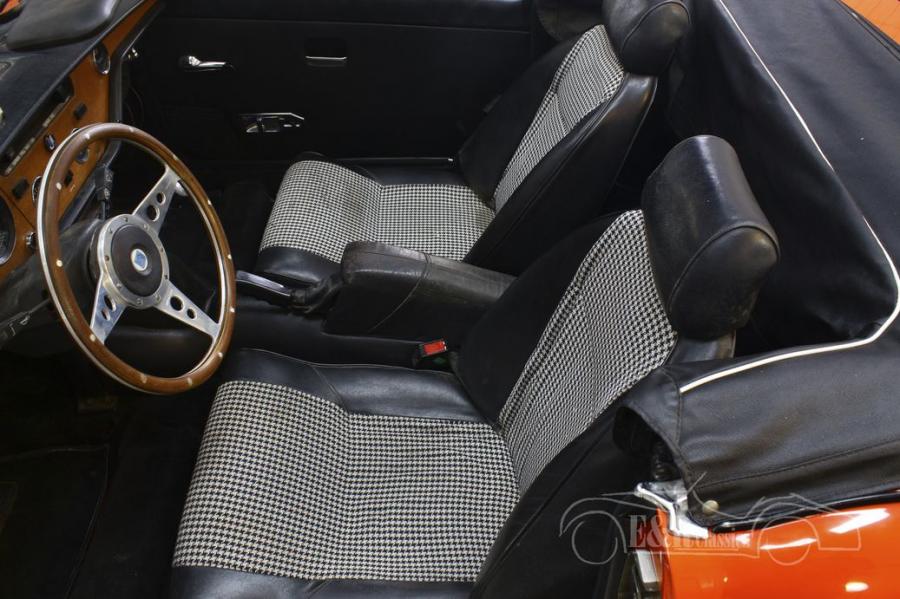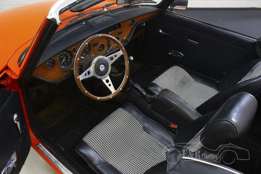 This classic has everything you want in a Triumph Spitfire. Beautiful paint, beautiful chrome accessories and a soft top that you can fold in no time when the sun is shining. The interior is equipped with upholstery with a Houndstooth motif, a Moto Lita steering wheel and wooden dashboard. To top it all off, the Spitfire is equipped with dual mufflers that not only look great, but also provide a fantastic sound that completely matches the sporty performance of this oldtimer.