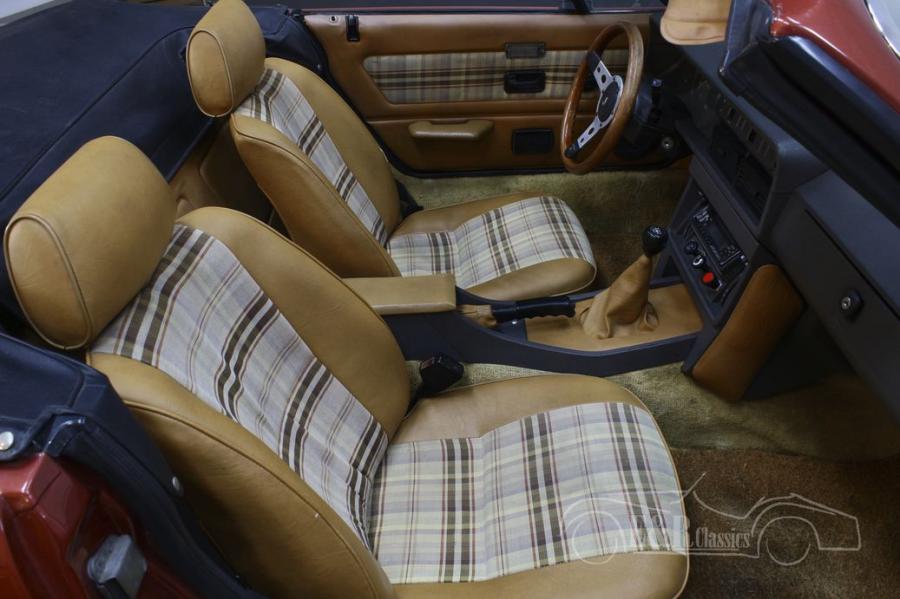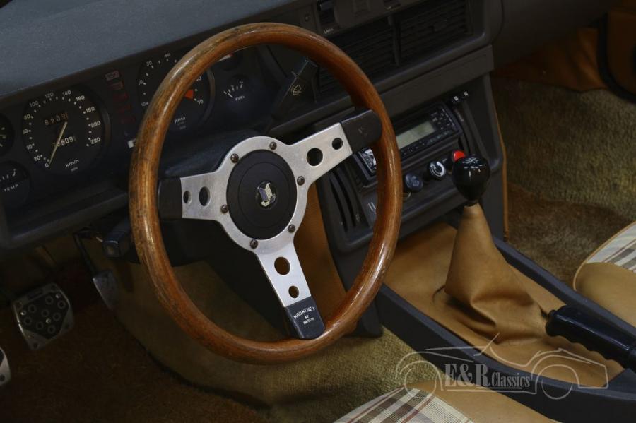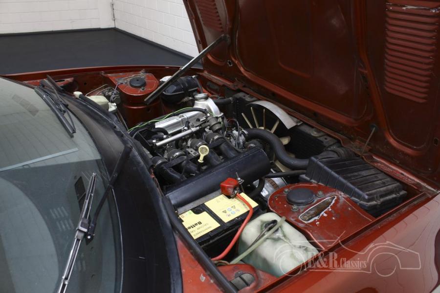 This Triumph TR7 has a dark red paint that fits perfectly with this classic. The alloy wheels look very nice under this TR7 and combine well with the paint. The TR7 is equipped with a light brown soft top and black hard top. The interior is fitted with light checkered upholstery and a wooden steering wheel. In short, a very complete TR7 that is becoming increasingly popular among collectors.