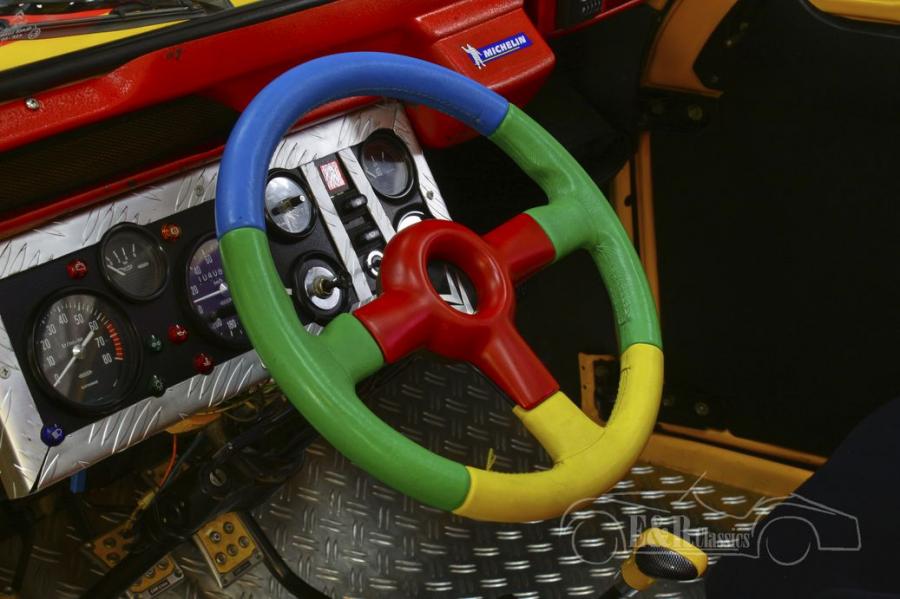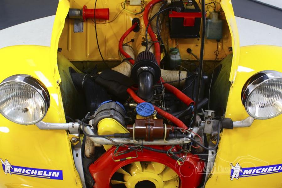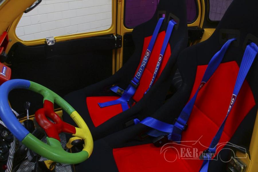 As you can see in the photos, this Citroën 2CV is anything but standard. For example, the fenders have been widened to make room for the wide rally tires. Various rally stickers have been applied and the rear windows are tinted. The interior has bucket seats with Sparco racing belts and tear plate on the floor.