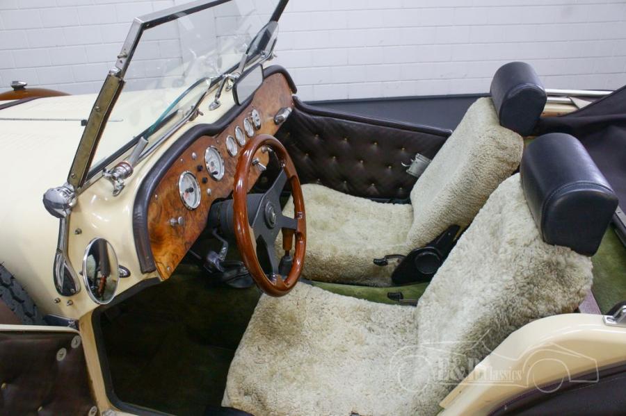 The classic that we offer for sale here is really a sight to see. The two-tone paint fits perfectly with the classic and emphasizes the beautiful lines even more. The chrome wire wheels are in very good condition and completely match this classic car. The interior has a wooden dashboard and steering wheel.