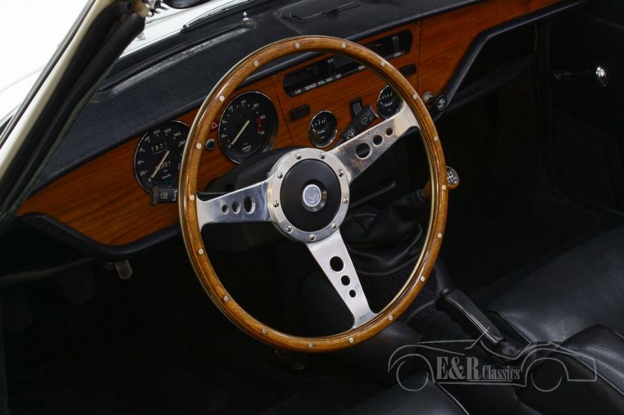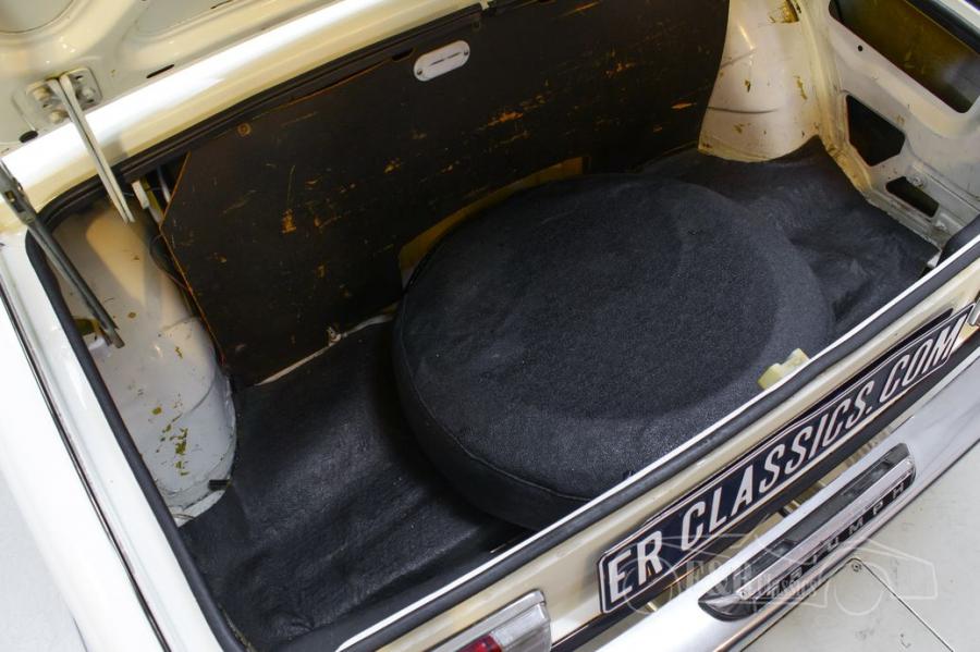 The oldtimer has a white paint that combines very nicely with all chrome accessories and the original Triumph rims. The interior is equipped with black upholstery that contrasts nicely with the white paint. To finish it off, a wooden dashboard, steering wheel and gear lever were chosen.