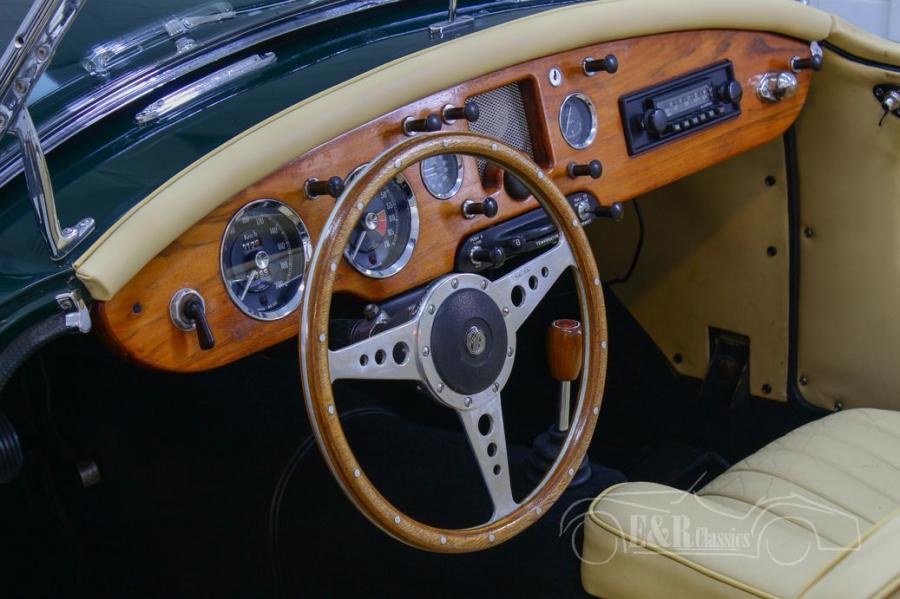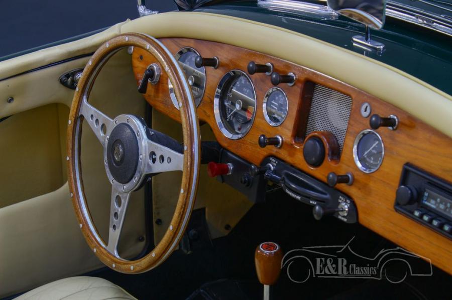 The British Racing Green looks fantastic on this classic car and combines beautifully with all the chrome accessories and the wire wheels. The interior is fitted with beige-coloured leather upholstery that completely matches the paint. To finish it off, a wooden dashboard, steering wheel and gear lever were chosen.