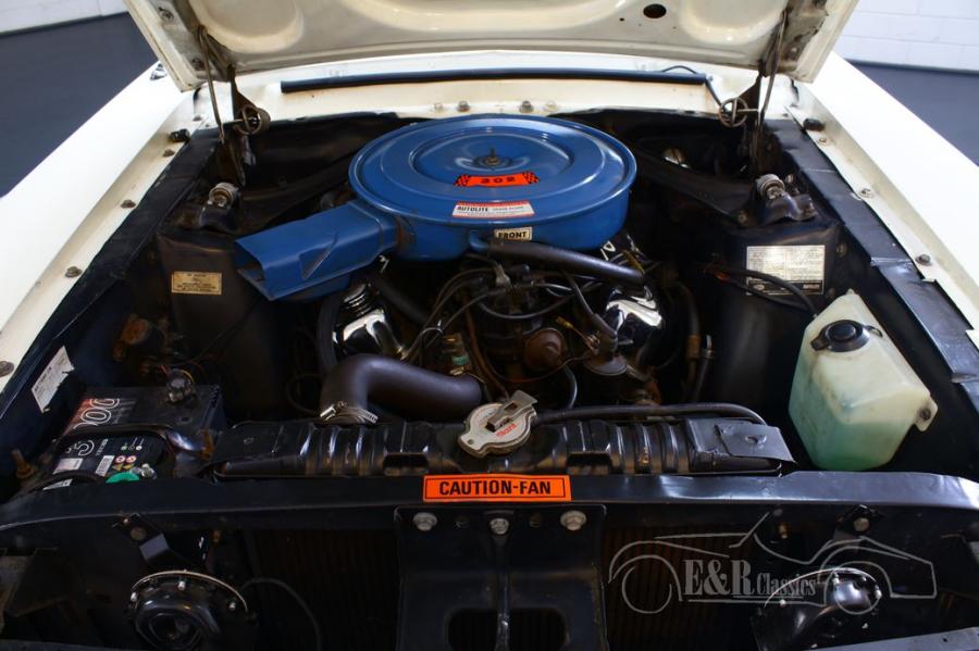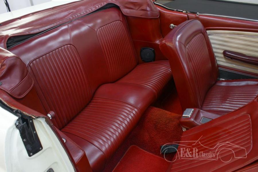 The classic has a white paint, which combines very nicely with all chrome accessories. The interior is equipped with dark red upholstery, which makes for a beautiful combination with the white paint. The Mustang is also equipped with a white soft top so that you can enjoy touring even in doubtful weather.
