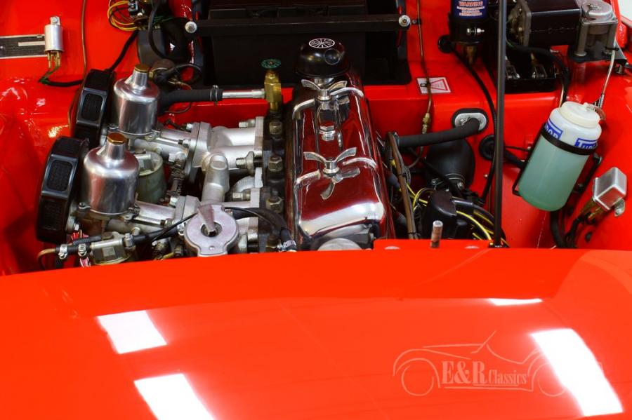 The Triumph TR3B that we offer for sale here has been body-off restored in the past and is both optically and technically in very good condition. The restoration is documented in a very extensive photo report. The complete maintenance history is also known and recorded in invoices. With its red paint, chrome accessories and beautiful chrome wire wheels, this Triumph TR3B is a real eye-catcher.