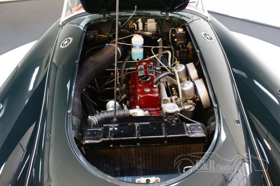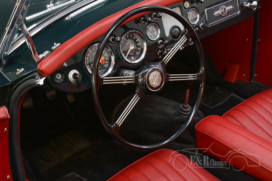 This classic has a colour scheme that you do not often encounter on an MGA. The MG has a dark green paint, red interior and bronze-coloured wire wheels. The interplay of these colours really makes a picture of it and gives the MGA a unique character.