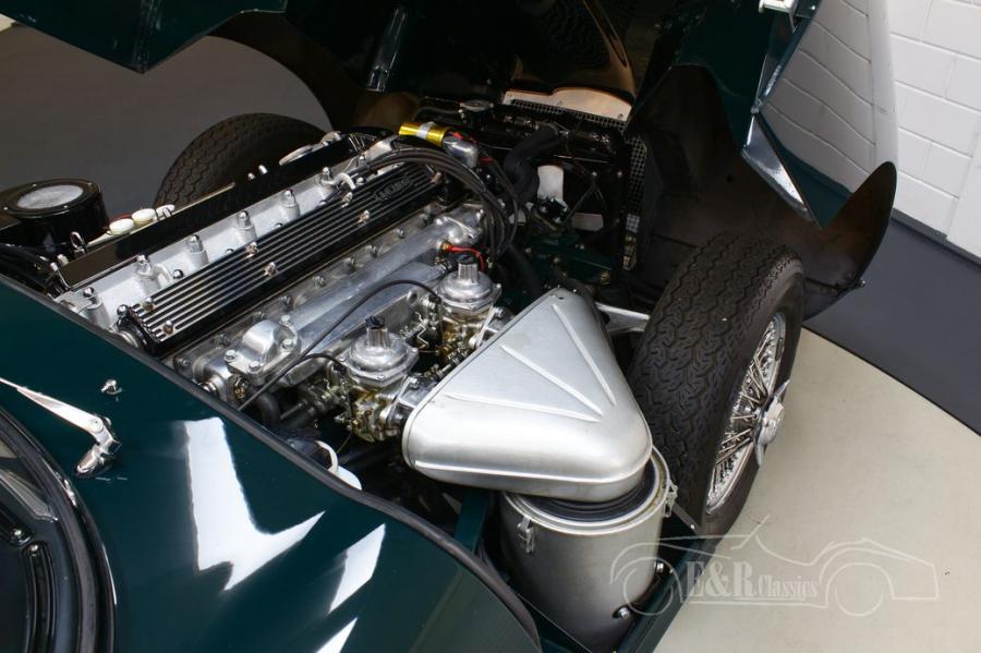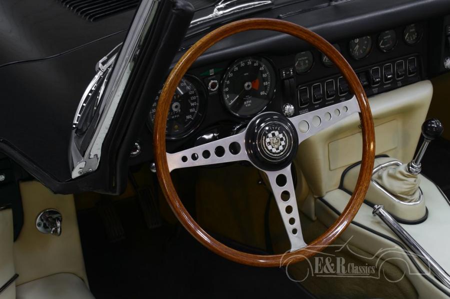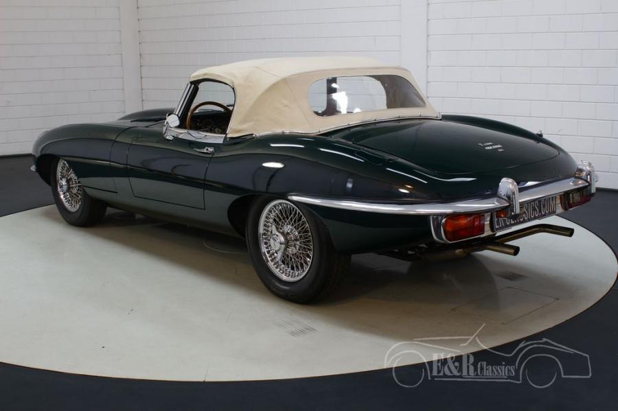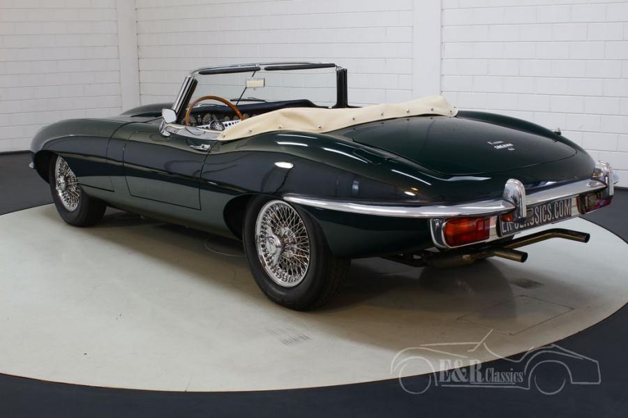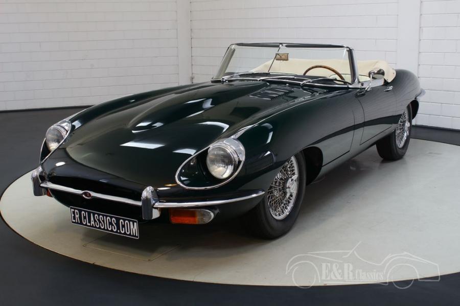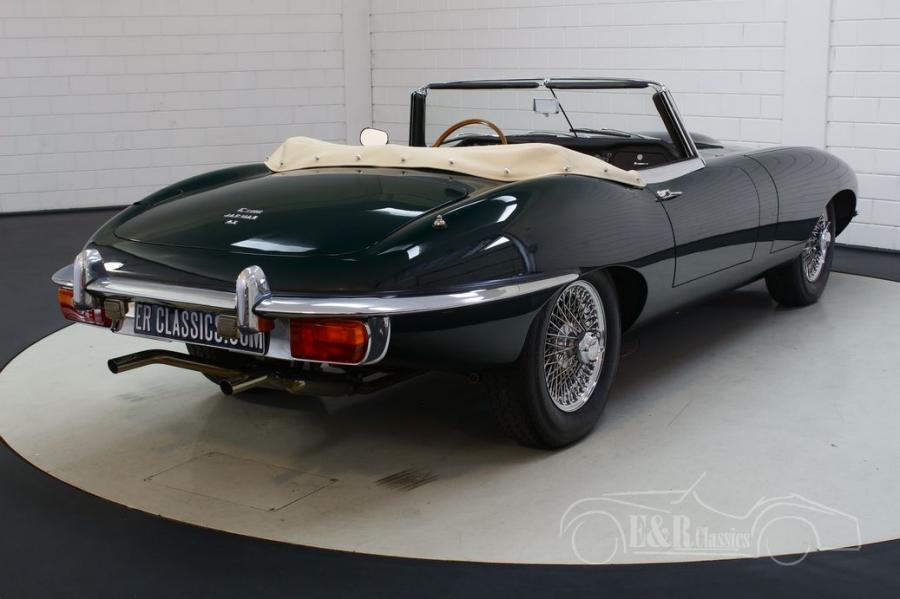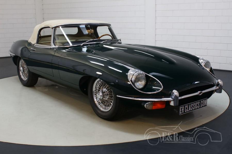 This Jaguar E-Type looks like an E-Type should look like. British Racing Green, chrome wire wheels, a beautiful beige leather interior and beautiful chrome accessories. The overall picture is exactly right.