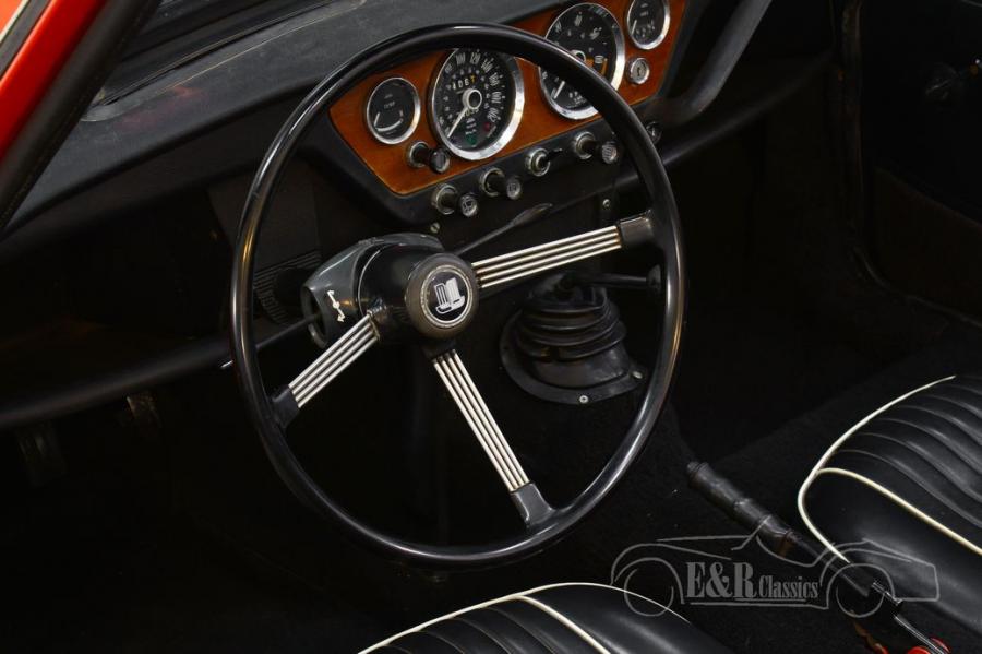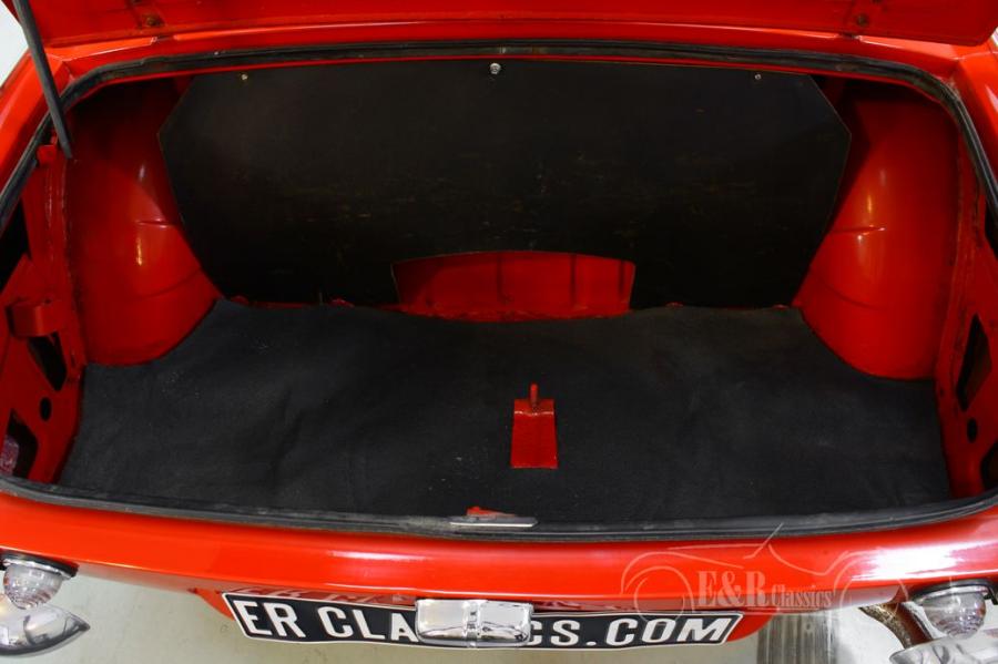 A Triumph Spitfire is already a striking appearance in today's street scene, but the red paint of this classic makes it an eye-catcher. The red paint suits the Spitfire very well and combines well with the chrome accessories. The interior has black upholstery with white piping. The dashboard is equipped with chrome counters and wood inlays, which provides a stylish, classic look that fits perfectly with this Spitfire.