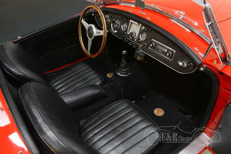 The red paint looks great on this classic and combines very nicely with all chrome accessories. As befits a real British Classic Car, it is equipped with a set of beautiful chrome wire wheels that completely match its sporty looks. The interior is in a very neat condition and is equipped with black upholstery and a wooden steering wheel.