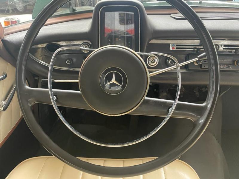 Interiores en muy buen estado. Volante color negro, con motivos en plata. Tapicería de piel color beige.