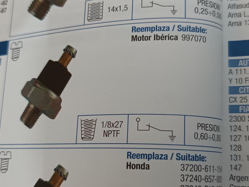 Se vende manocontacto de presion de aceite para Avia 1250, 2500 3500, 4000, 5000, 7000, 8000. Ebro D 600, E 600 ,D 703, E 703, F100, F108, F270, F275, P 112, P137, P170, P190. John Deere 515 y 517. Renault tractores, Willys Viasa. Perkins 4/99, P-3, P-4... Es nuevo a estrenar en perfecto estado.