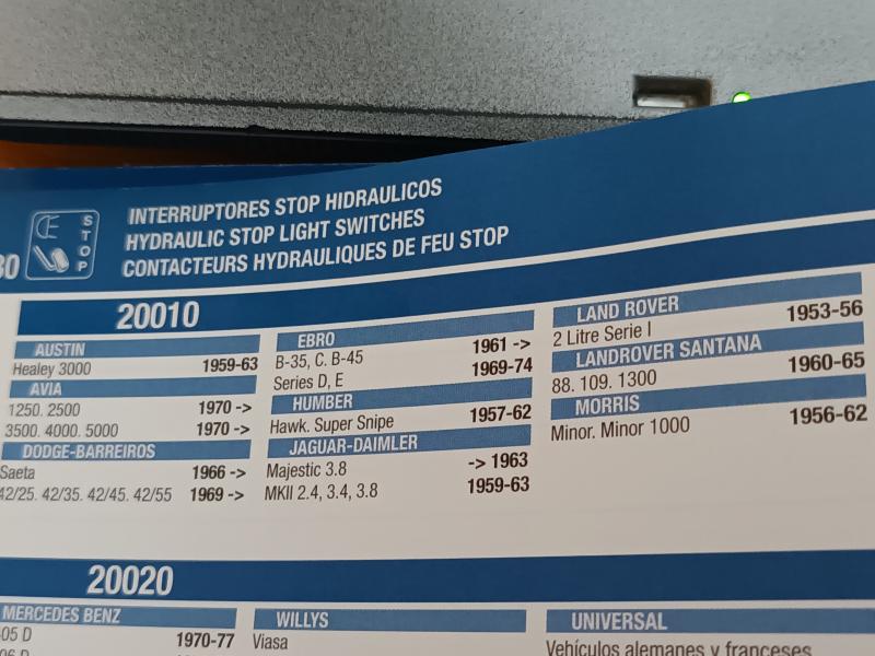 Se vende interruptor hidráulico de luz de freno para Austin Healey 3000, Avia 1250 2500 3500 4000 5000, Dodge Barreiros Saeta, 42/25 42/35 42/45 42/55, Ebro B 35 B45 C35 series D E, Jaguar MkII Majestic 3.8,Land Rover serie 1, Santana 88 109 y1300, Morris Minor. Es nuevo a estrenar en perfecto estado