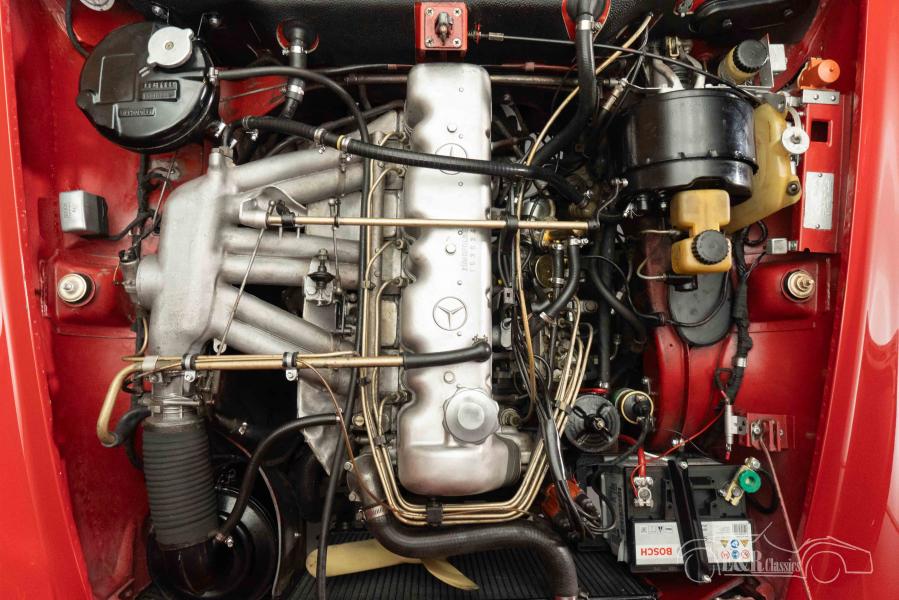 The Mercedes-Benz that we offer for sale here is truly a sight to behold. It is finished in the beautiful Signal Rot color that combines very nicely with the chrome and the red wheels. The interior was recently renovated by our own workshop and is finished in a beautiful dark brown color. The soft top is also dark brown, which creates a beautiful look.