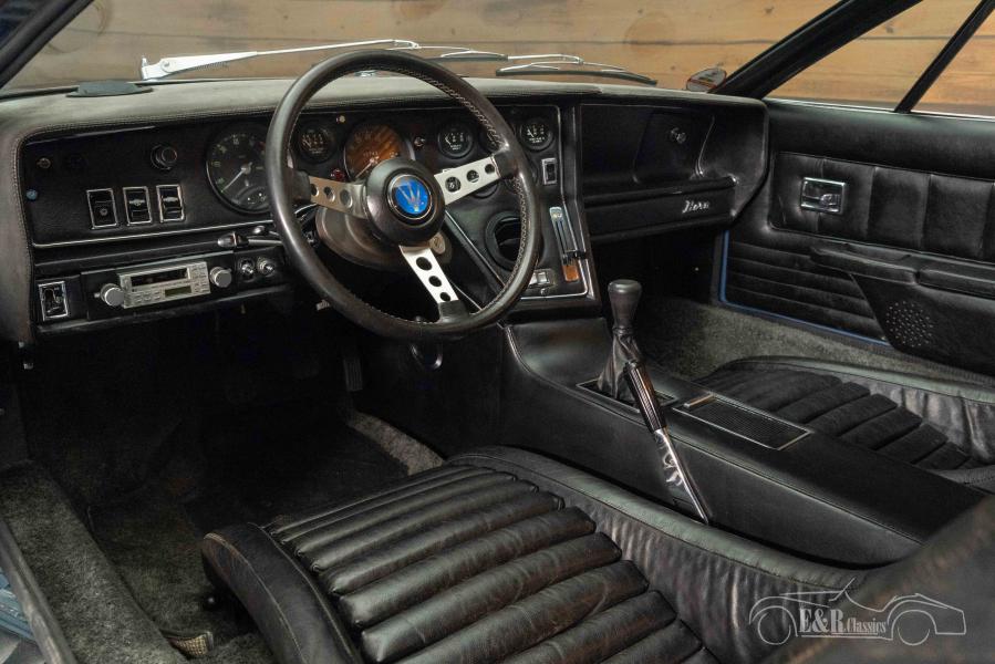 The Maserati Bora that we offer for sale here was repainted in the factory colour Celeste during its restoration. A beautiful light blue metallic colour that completely matches the exclusive look of this Italian sports car. It stands on a set of original Campagnolo rims with stainless steel heart that combine beautifully with the window frames and the stainless steel roof of the classic. The interior is in a neat, original condition and is equipped with black leather upholstery.