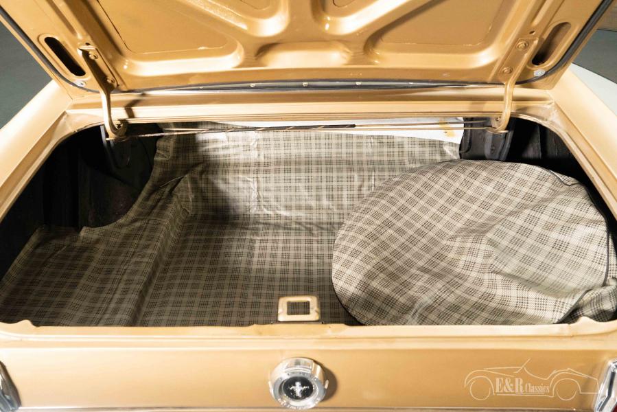 Un Ford Mustang ya tiene una apariencia hermosa en sí mismo, pero el automóvil que ofrecemos a la venta aquí llama la atención. Este Mustang Cabriolet tiene un acabado en el hermoso color Prairie Bronze. Una pintura de color bronce que le sienta muy bien a este clásico y que combina muy bien con el cromado. El interior está en buenas condiciones y está equipado con tapicería de cuero artificial negro y consola central. El Mustang tiene una capota blanda hidráulica negra que puedes plegar con solo presionar un botón tan pronto como brilla el sol.