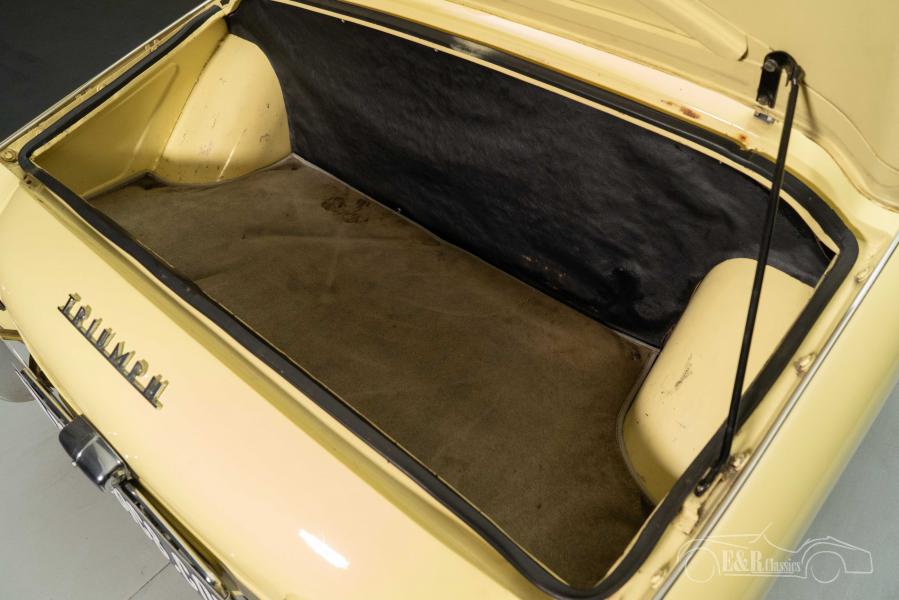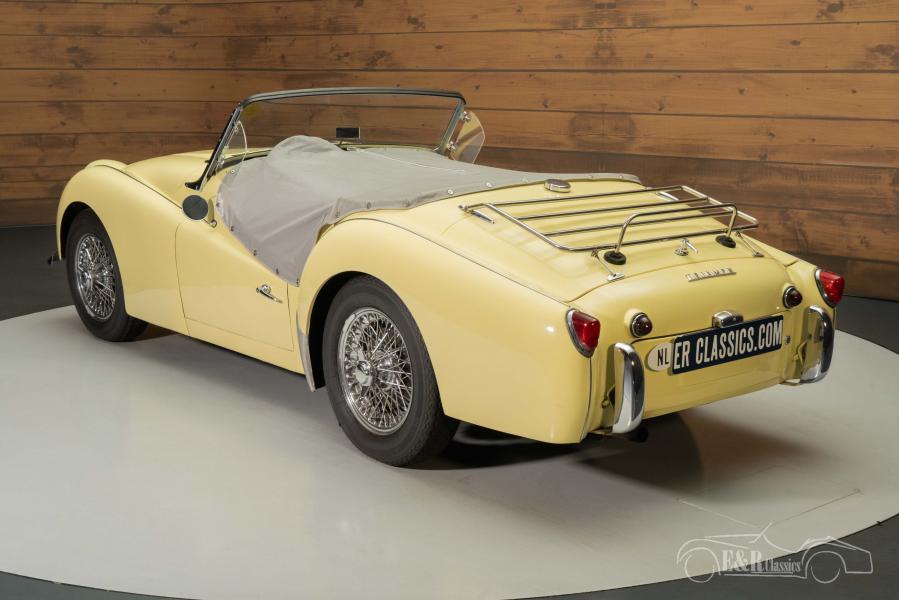 The Triumph TR3A that we offer for sale here is optically in good condition. It has yellow paint and various extras such as a chrome luggage rack, black soft top, grey tonneau cover and chrome wire wheels. The grey interior has some signs of wear here and there that completely match the character of this British Classic Car. In short, a technically very well maintained Triumph TR3A that is completely ready for its new owner.