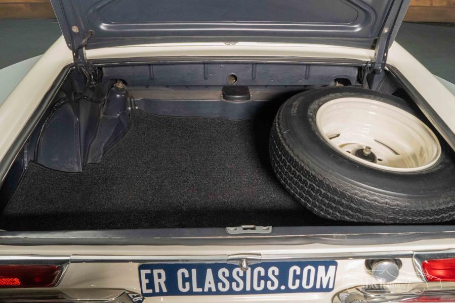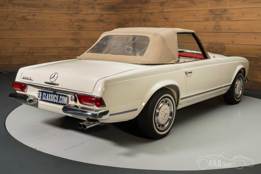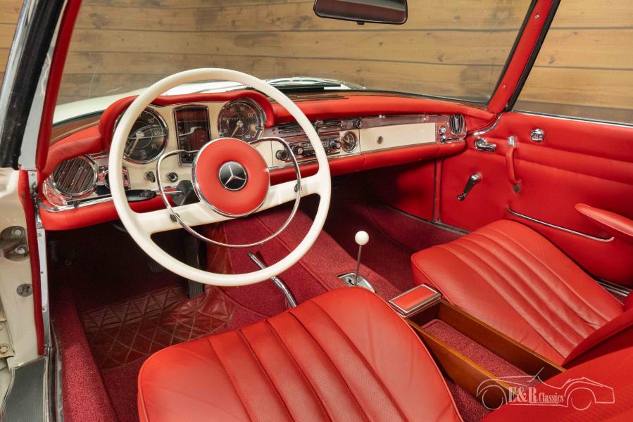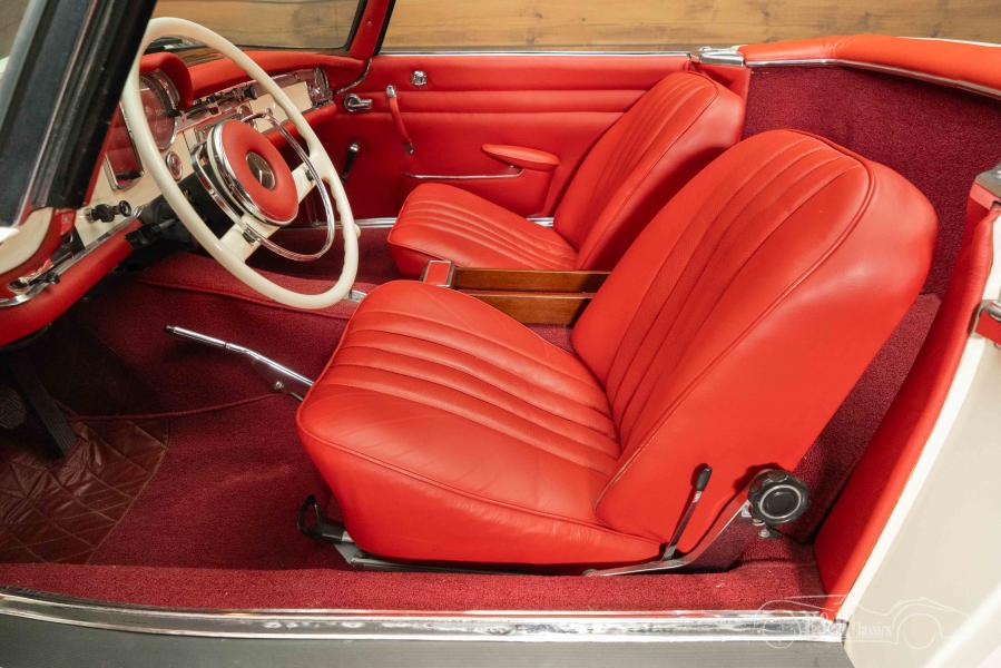 The Mercedes-Benz 230 SL that we offer for sale here has a very stylish appearance. It has a beautiful cream-coloured white paint that combines very nicely with the chrome. The red interior pops and contrasts very nicely with the white paint. The interplay between the paint and the interior makes it a real eye-catcher. The Pagode is supplied with a hard top and a beige soft top.