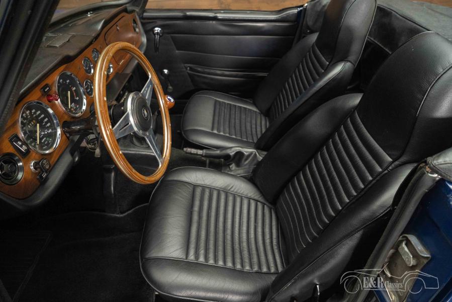 The Triumph TR6 that we offer for sale here has a beautiful dark blue paint. This colour looks great on a 70's classic and combines very nicely with the chrome. The interior of the Triumph is in very good condition and a few years ago a new dashboard and Motolita sports steering wheel were installed and the seats were renewed. The TR6 is also equipped with a black soft top that you can fold in an instant so you can enjoy the fresh air while touring.