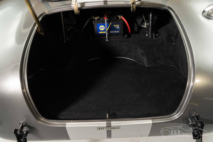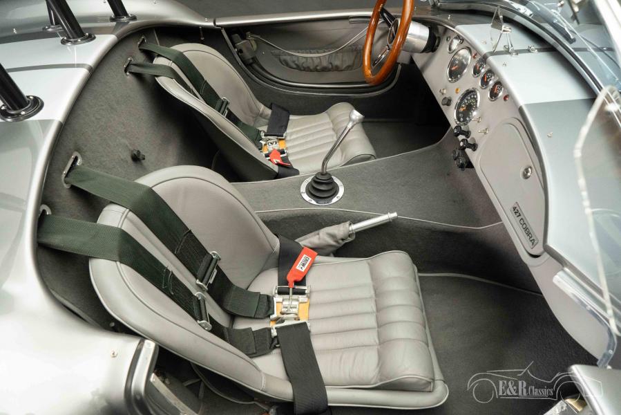 The Backdraft Cobra that we offer for sale here is truly a unique appearance. It has a beautiful silver-grey metallic paintwork and has a lighter grey racing stripes. The black alloy rims with wing nuts look great on the Cobra and its wide tires complete the sporty look. The interior is equipped with grey leather bucket seats that are equipped with 4-point racing belts. The classic has a black soft top.
