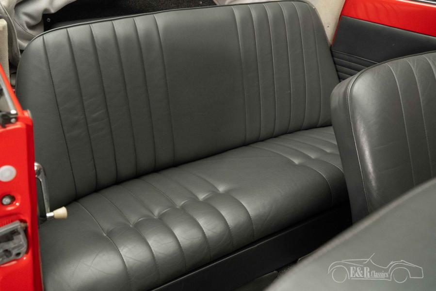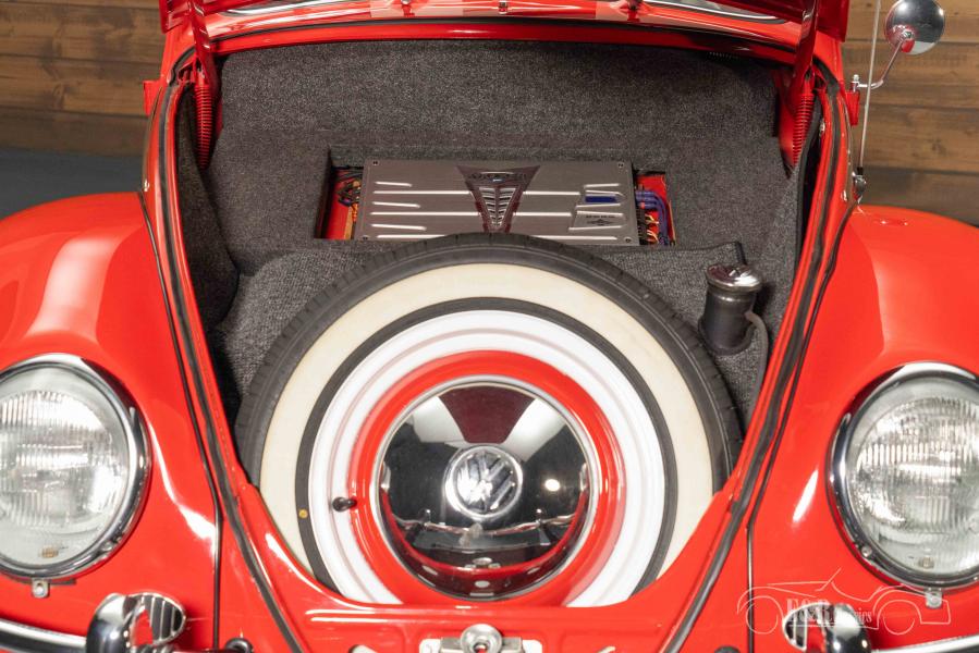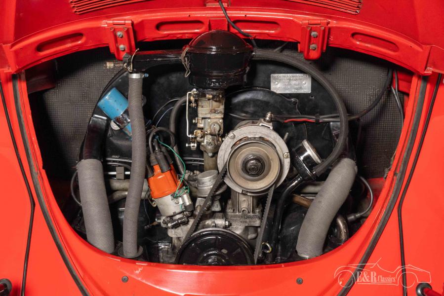 The 1960s VW Beetle Cabriolet that we offer for sale here is truly a sight to behold. It is finished in a beautiful red paintwork that combines very nicely with the chrome and the white walls. The interior has a grey carpet and real leather upholstery. To complete the whole, a dark grey, fabric soft top was chosen.