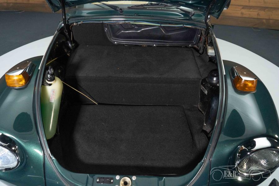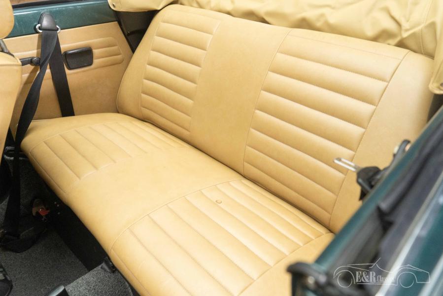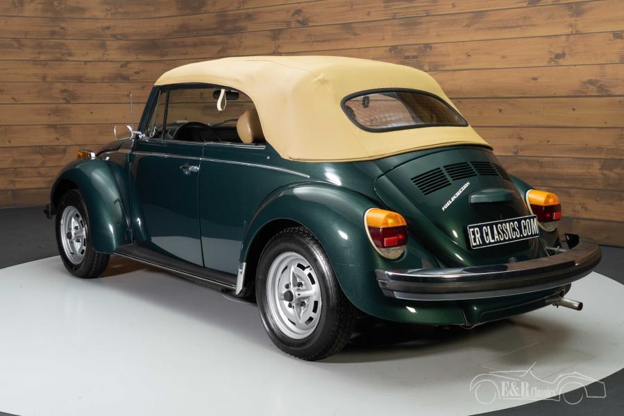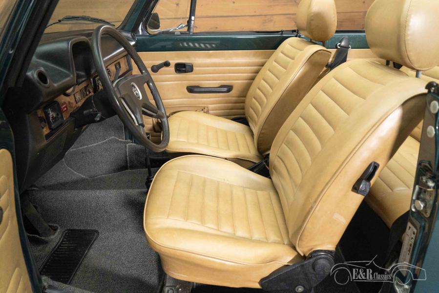 The colour on this Volkswagen Beetle Cabriolet is really a sight to see. The Beetle has a dark green metallic paint that combines beautifully with the chrome bumpers and decorative strips. The interior is equipped with light brown upholstery and a dashboard with wood accents. To finish it off, the Beetle is equipped with a new light brown soft top that fits perfectly with the dark green paint. In short, a very fully equipped Volkswagen Beetle Cabriolet that is completely ready for many beautiful tours.