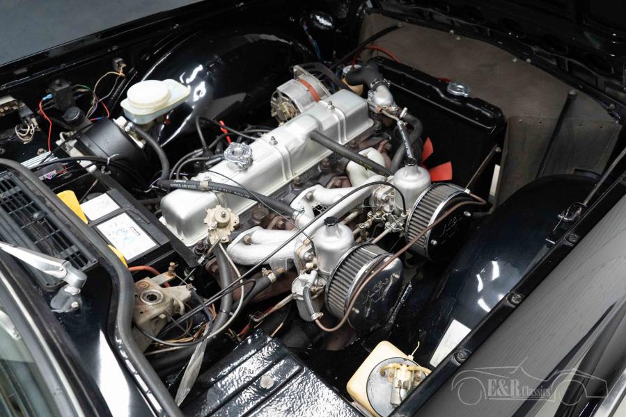 Que distingue a este Triumph TR6 de otros clásicos es su hermoso esquema de color. A menudo te encuentras con una TR6 en verde o rojo, pero la pintura negra intensa de este clásico le da a la TR6 un carácter realmente distintivo. Junto con el interior negro y la capota blanda negra, este llamado Triple Black TR6 realmente hace una declaración. El interior se renovó parcialmente recientemente y se equipó con nuevas fundas de asiento y espuma. Baja la capota, coge el volante Moto-Lita, gira la llave y disfruta de este gran Coche Clásico Británico.