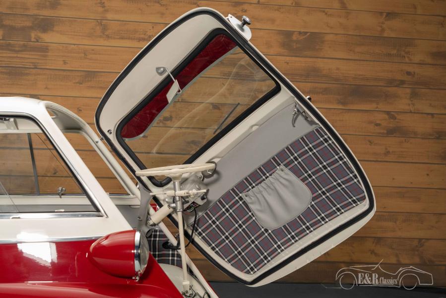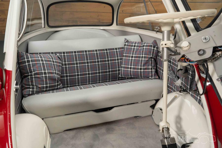 A BMW Isetta is a rare sight that you will not easily encounter, let alone in the condition this car is in. The two-tone paintwork looks beautiful on the BMW and makes it a real eye-catcher. The interior is a combination of artificial leather and fabric with a nice diamond pattern that fits perfectly with a 1950s classic. The Isetta is also equipped with a red sun visor and a folding roof so you can enjoy the fresh air while driving.