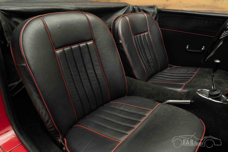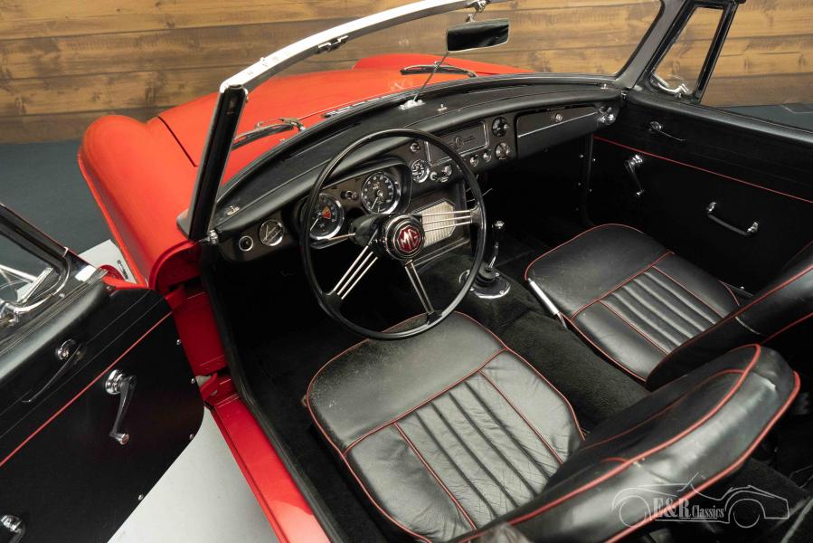 The MGB Cabriolet that we offer for sale here has a nice colour scheme. The red paint fits perfectly with a British Classic from the 1960s and combines beautifully with the chrome and wire wheels. The interior of the MGB has some minor signs of wear and is otherwise in neat, original condition. A black soft top was chosen that you can fold in an instant so that you can enjoy the fresh air while driving.
