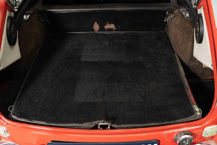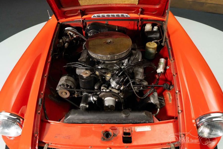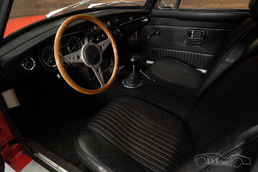 The MGB GT V8 Costello that we offer for sale here has a beautiful red paint that has been repainted in the past. The artificial leather interior of the Costello is in neat condition with minor signs of wear. The MGB GT is equipped with a Moto-Lita sports steering wheel that completely matches this 1970s British Classic.