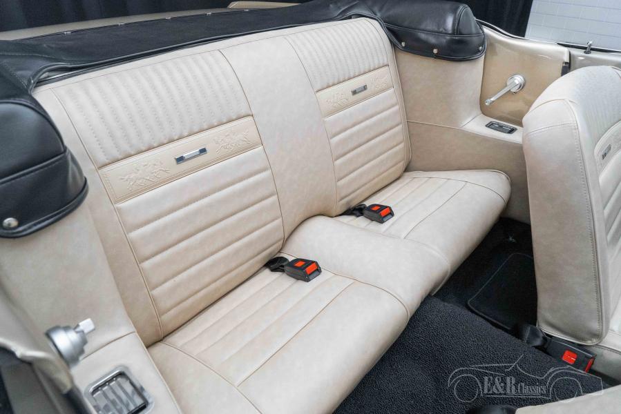 Como puedes ver en las fotos, este Ford Mustang Cabriolet es realmente un espectáculo digno de ver. El Mustang está acabado en el hermoso color Sauterne Gold. Un color que le sienta muy bien a este clásico y le da un carácter distintivo. El cromo resalta en este Mustang y combina a la perfección con la pintura Sauterne Gold. El interior del Mustang Cabriolet está en muy buenas condiciones y tiene tapicería 'Pony' de color beige y volante de madera. Para colmo, el Mustang está equipado con una capota blanda blanca hidráulica para que puedas disfrutar del aire libre mientras viajas cuando hace buen tiempo.