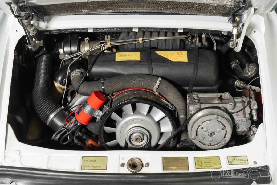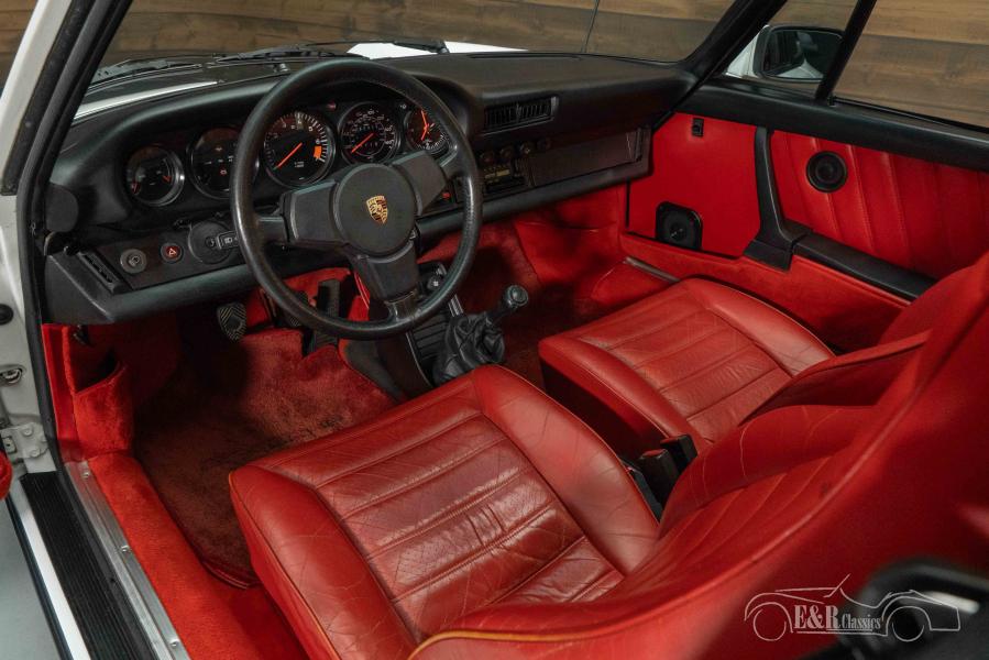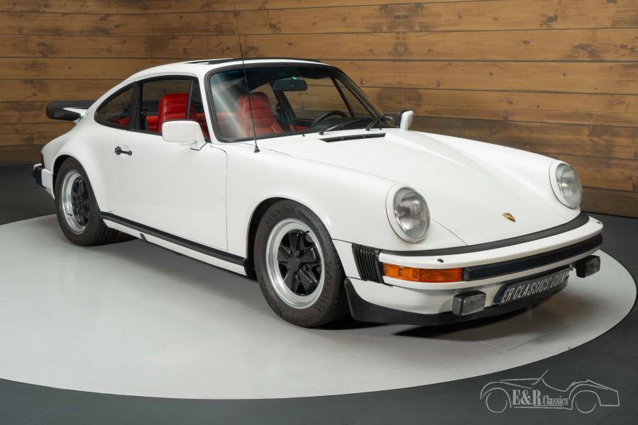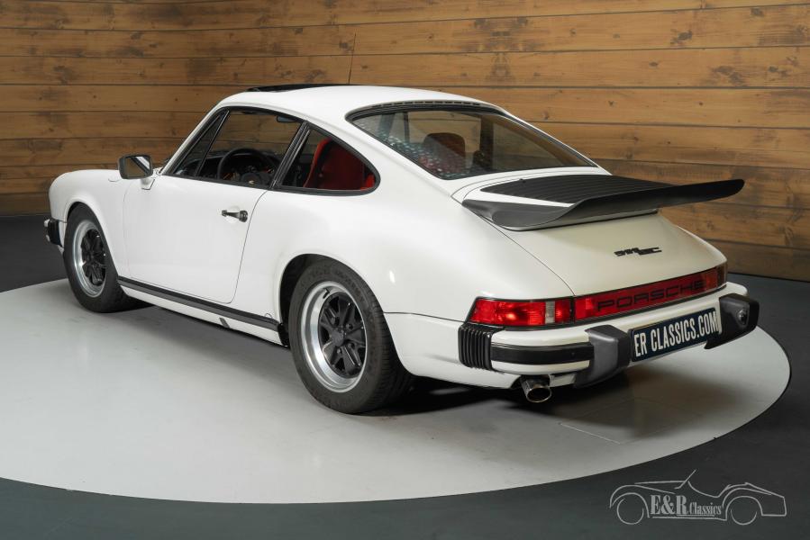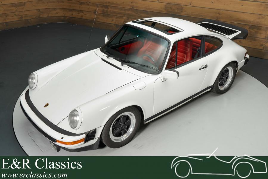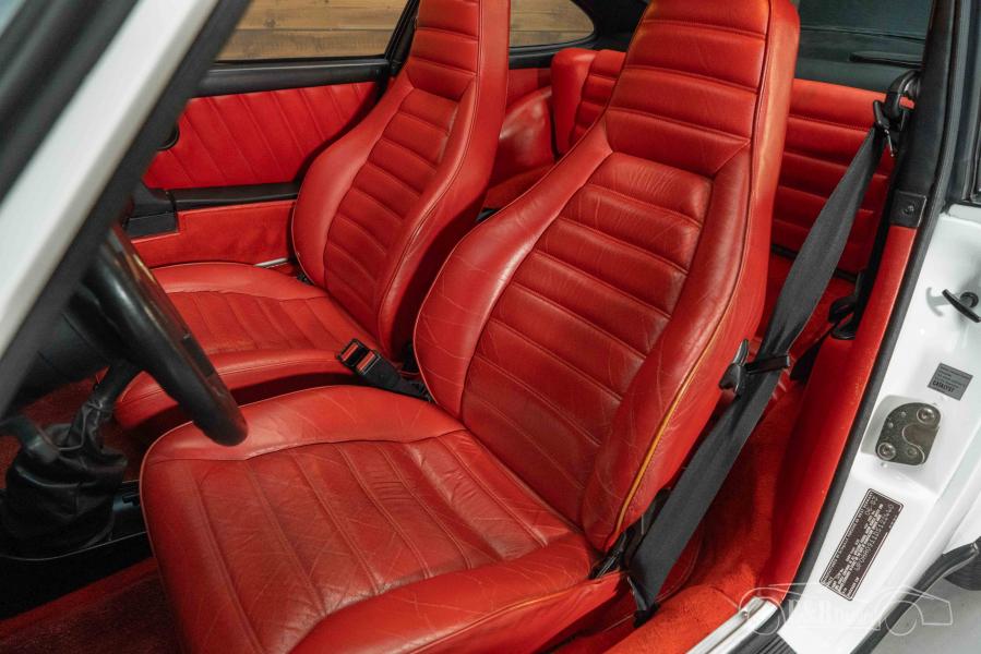 The overall picture of the Porsche 911 SC Coupe that we offer for sale here is completely correct. It is finished in the original factory colour Grand Prix White, which fits perfectly with an 80s classic. The paintwork has been partly resprayed in the past. The Porsche stands on a set of Fuchs rims and has a front and rear spoiler that give it an extra sporty look. Furthermore, the Porsche is equipped with various options such as an electric sliding roof, Blaupunkt radio, Bilstein shock absorbers, front fog lights, heated windshield and air conditioning. What is really special about this 911 is its red leather "can-can" interior. This interior pops out and, together with the white paintwork, makes it a real eye-catcher.