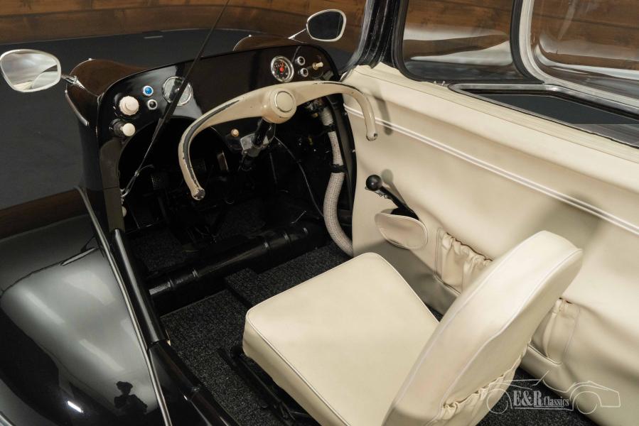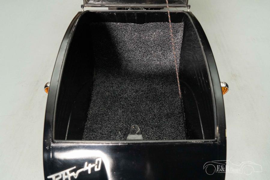 El Messerschmitt KR 200 que ofrecemos a la venta aquí es realmente un espectáculo digno de contemplar. Durante la restauración se pintó de negro y se equipó con un interior de cuero artificial blanco. Como si el aspecto del Messerschmitt KR 200 no fuera lo suficientemente especial, este clásico viene con un remolque PAV40 de 1967 a juego con el mismo estilo que el Messerschmitt.