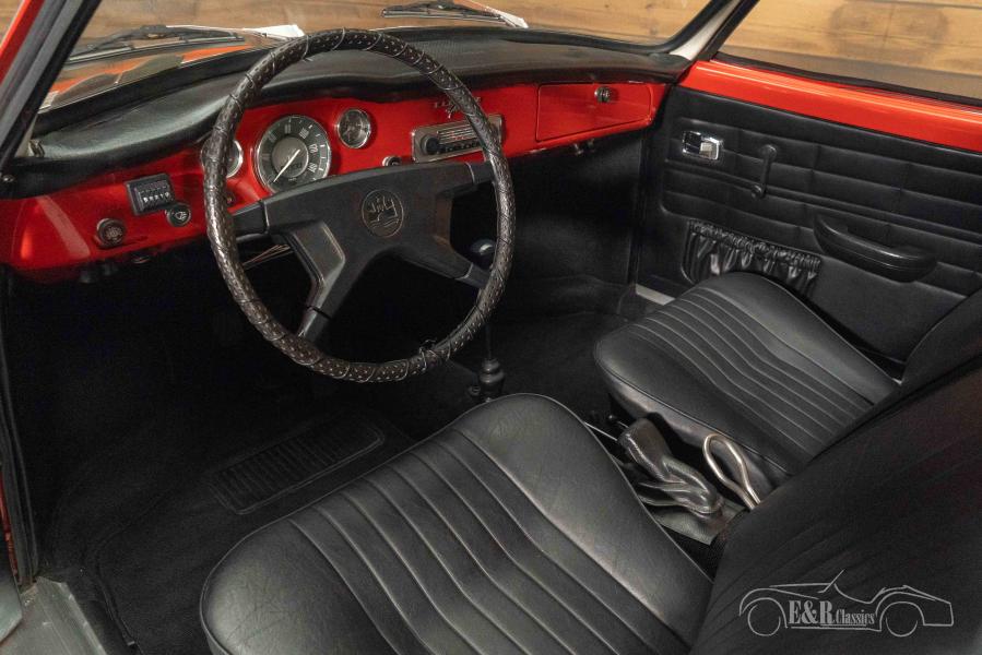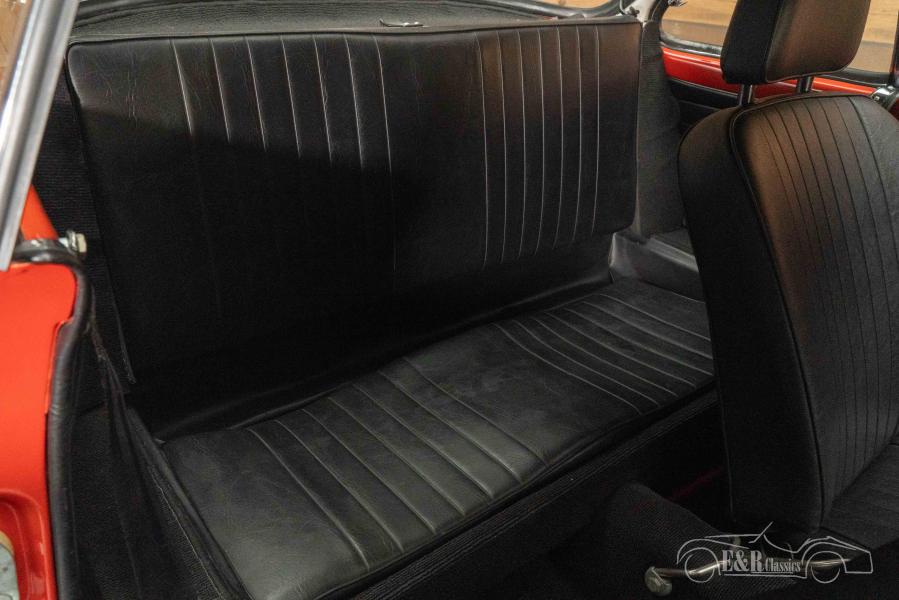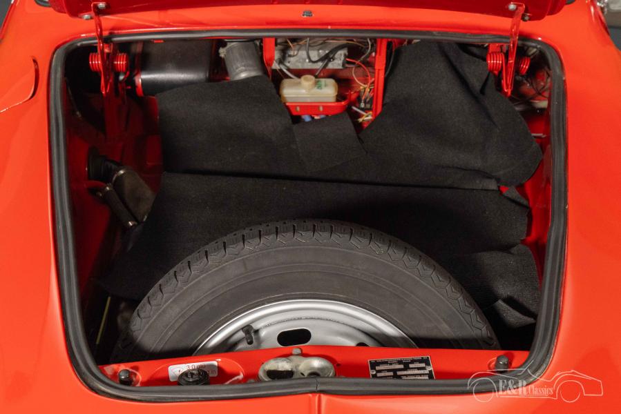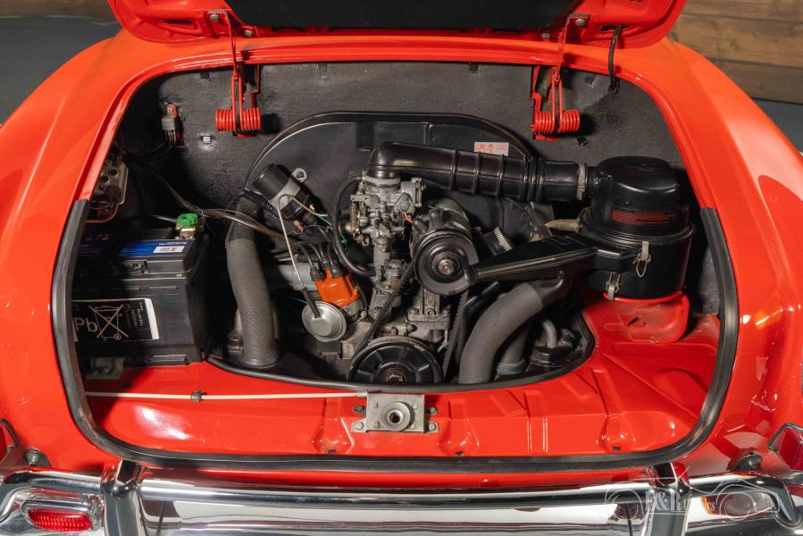 El Karmann Ghia Coupé que ofrecemos aquí es realmente una imagen para contemplar. Está acabado en una hermosa pintura roja que luce muy bien en el clásico y combina muy bien con el cromo. El interior está en un estado impecable y original y está equipado con tapicería de cuero sintético negro.