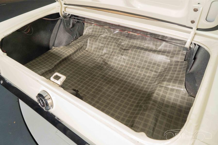 El Ford Mustang Cabriolet que ofrecemos aquí está acabado en una hermosa pintura blanca que combina muy bien con el cromo y le da un aspecto elegante. El clásico tiene la popular parrilla GT-Look con faros adicionales que le dan un aspecto deportivo. El interior del Mustang está equipado con tapicería negra 'Pony' y alfombra negra. Para completar el conjunto, se eligió una capota blanda hidráulica negra que se puede plegar con solo tocar un botón tan pronto como brille el sol.