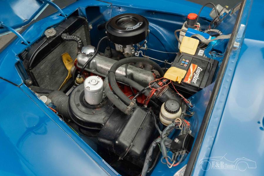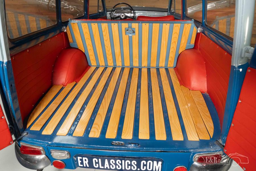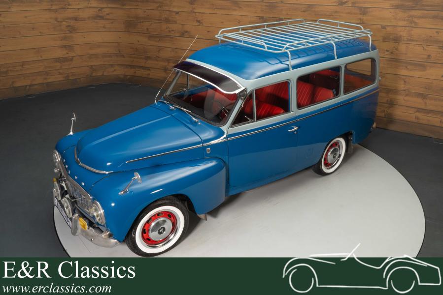 The Volvo Duett that we offer for sale here is really a picture to behold. It is finished in a two-tone blue paintwork that completely suits this 60s classic. The Volvo is also equipped with some nice extras such as a roof rack, sun visor, bumper mirrors, extra spotlights and white walls. The red interior of the Duett pops out and combines very nicely with the blue paintwork. The loading platform is covered and inlaid with wood.