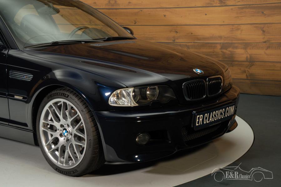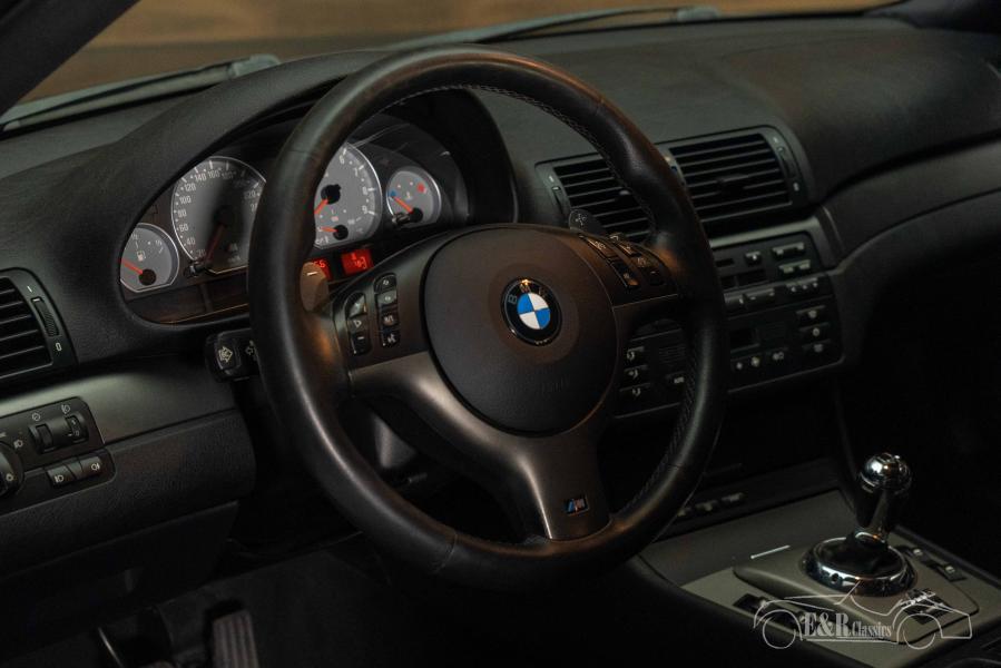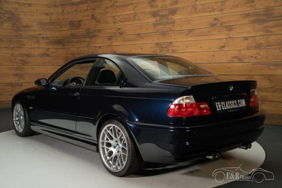 The BMW E46 M3 Coupe that we offer for sale here is really great to see. It is executed in the beautiful colour Carbonschwarz. A metallic paint that turns black in the shade and dark blue in the sun. Another plus are the original CSL rims that look great under the M3 and combine very nicely with the paint. The interior is in a very neat condition and has black leather and fabric upholstery. This E46 M3 Coupe also has various options such as seats with memory function, climate control, rear parking sensors, anthracite-coloured headliner and titanium shadow interior trim.