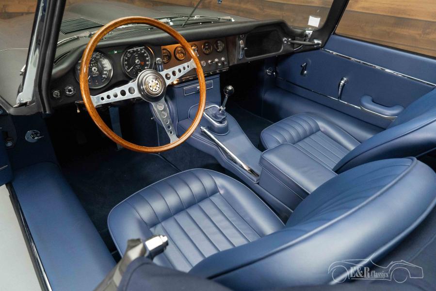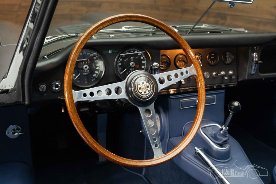 The E-Type series 1 Cabriolet that we offer for sale here is truly a sight to behold. It is finished in the beautiful colour Gunmetal Grey. A colour that looks great on the classic and combines very nicely with the chrome and the chrome spoke wheels. The dark blue leather interior contrasts beautifully with the paintwork and makes it a beautiful whole. A dark blue Sonnenland soft top was chosen that completes the overall picture.