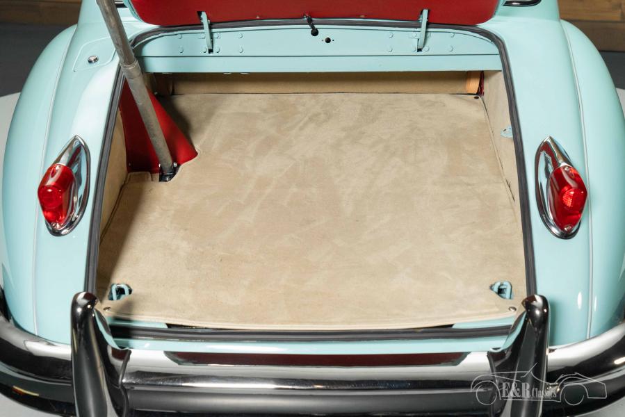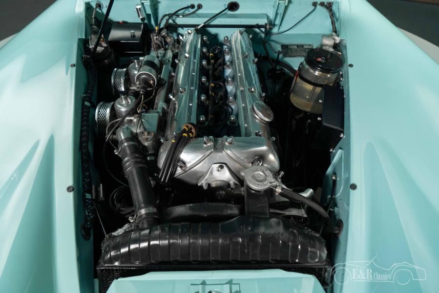 The Jaguar XK150 FHC that we offer for sale here is truly a sight to behold. It is finished in the beautiful color Ocean Blue that gives this British classic a distinctive character. The combination with the chrome and the black powder-coated spoke wheels makes it a real eye-catcher. What is really special about this XK150 is the Webasto sliding roof, which was delivered from the factory. The interior is equipped with beige carpet and burgundy red leather upholstery.