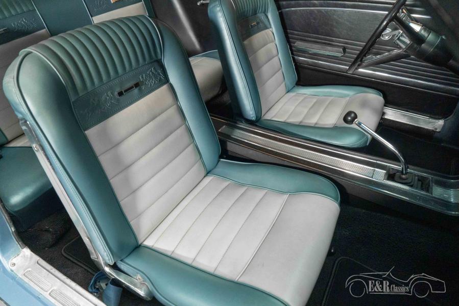 El Mustang que ofrecemos a la venta está acabado en una hermosa pintura metalizada azul claro que luce muy bien en el clásico y combina muy bien con el cromo y las llantas deportivas. El interior del Mustang presenta algunos signos de desgaste aquí y allá y está equipado con un interior Pony de dos tonos que combina muy bien con la pintura.