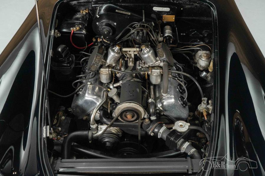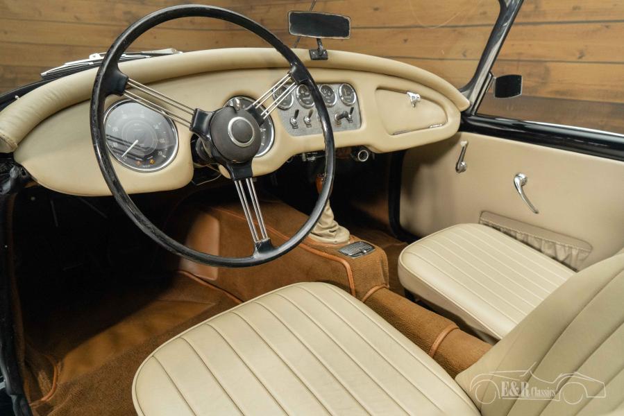 This Daimler SP250 exudes pure elegance with its deep black paintwork, chrome and beautiful chrome wire wheels. The contrasting beige interior and matching soft top provide a refined and stylish appearance. The interior offers a perfect example of classic British luxury, with attention to detail and comfort. This car combines timeless beauty with driving pleasure, making it a perfect choice for the enthusiasts of unique classics.