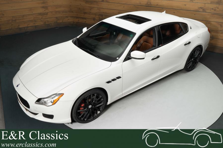 The Maserati Quattroporte GTS stands out with its dazzling white paintwork, combined with stylish black details such as the grille, trims, rims, handles and logos. The exterior exudes extra sportiness, supported by exclusive design features. The interior offers a luxurious atmosphere thanks to the dark brown leather interior, which exudes both comfort and luxury. The rich standard equipment, including high-quality materials and luxurious finishing details, emphasises the exclusive character of the GTS. Extras such as the sliding roof ensure an ultimate driving experience. This model is a perfect balance between elegance and powerful performance – a real eye-catcher.