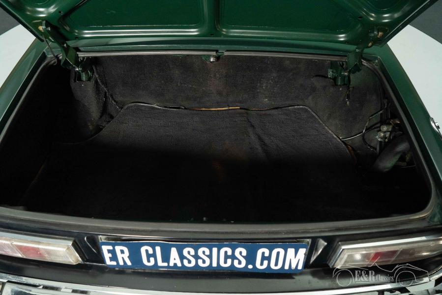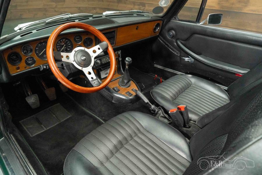 El exterior de este Triumph Stag rezuma elegancia pura con su atemporal pintura Verde British Racing. El techo rígido original y la capota de lona negra ofrecen flexibilidad para todas las estaciones. El diseño se completa con llantas clásicas y detalles cromados, que le dan al Stag su aspecto distintivo. El interior ofrece una encantadora combinación de lujo y deportividad, con una tapicería bien conservada y un salpicadero de madera con carácter. Esto, combinado con la pintura verde intenso, crea un elegante contraste. Este Triumph Stag es un coche ideal para el conductor, con algunas pequeñas señales de uso, pero que ofrece un placer de conducción puro con una auténtica experiencia V8.