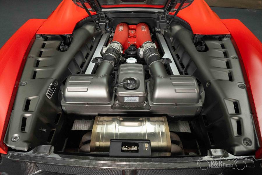The exterior is finished in iconic Rosso Corsa with matching red painted brake calipers and 19" alloy wheels, which completes the sporty look. The popular Challenge rear grille in carbon and the headlight washers emphasize the racing DNA of this Ferrari. It is also enjoyable inside: the black leather interior is equipped with red stitching, an interior package in carbon, aluminum sill panels and pedals, electrically adjustable and heated seats and a sports steering wheel with aluminum F1 flippers. The Clarion navigation system, windshield and the Alcantara sun visors provide a mix of luxury and sportiness that perfectly matches the looks of this Italian thoroughbred.